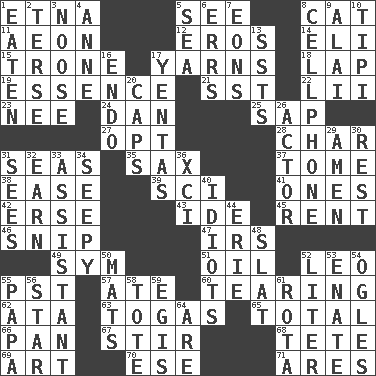 ACROSS 1. Inactive volcano in Sicily 5. Observe 8. Feline 11. A really long time 12. Greek god of love 14. Biblical high priest 15. Marketplace scale 17. Tall tales 18. Pet locale 19. Core 21. Fast jet (abbr.) 22. Cards in a Roman deck? 23. Born 24. One of the 12 tribes of Israel 25. Plant excrement 27. Choose 28. Burn to charcoal 31. Oceans 35. Saxophone 37. Heavy book 38. Comfort 39. _-fi 41. Washington bills 42. Celtic language 43. Binary compound 45. Monthly bill 46. Sever or remove by pinching or nipping 47. Big collection agency 49. Symbol (abbr.) 51. Petroleum 52. Lion 55. Pacific Standard Time (abbr.) 57. Had dinner 60. Rending 62. _ moment's notice (2 wds.) 63. Ancient Roman robes 65. "_____ Recall" 66. Baking dish 67. Commotion 68. Wig 69. Nonscientific branch of learning 70. Compass dir. 71. Ancient Greek god of war DOWN 1. Ingested 2. Laconic 3. Trap for birds or small mammals 4. Singer Murray 5. Ocean 6. Blunders 7. Immeasurably long periods of time 8. Portable communications device 9. Jai _ 10. Native american tent (variation) 13. Fast planes 16. Inside; within (prefix) 17. Gossips 20. Smile enhancers 26. Thespian 29. So be it 30. Relief 31. Observes 32. Merit 33. Aide 34. Oozy 36. One more than ninety 40. Foolish or stupid persons 44. One of the Great Lakes 48. Narrow board 50. Floor protectors 52. 61 cubic inches 53. Maternal 54. Stares 55. Dad 56. Play the lead 58. Carry 59. Armor plate that protects the chest 61. Round or rotation of duties 64. "We ___ not amused" (Victoria)