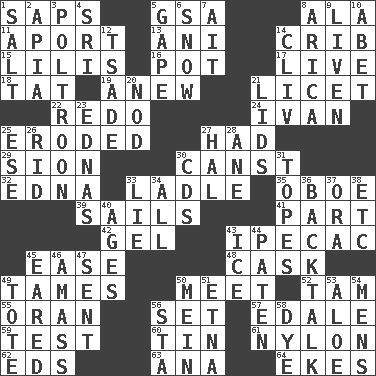 ACROSS 1. Plant excrements 5. Girls' org. (abbr.) 8. Insect wing 11. To the left, to Queeg 13. Black tropical American cuckoo 14. Baby bed with high sides 15. Ms. Damita and namesakes 16. Cooking vessel 17. Moving, as bait 18. Make lace 19. Afresh 21. It is permitted: Lat. 22. Do over again 24. "Terrible" tsar 25. Eaten away 27. Possessed 29. The Jewish people; Israel 30. 2nd pers. sing. pres. of can (arch.) 32. Pulitzer Prize-winning author Ferber 33. Dipping utensil 35. Mitch Miller's instrument 39. Travels by water 41. Role in a play 42. Set 43. Medicinal drug used to evoke vomiting 45. Relaxation 48. Keg 49. Corrects by punishment or discipline 50. Rendezvous 52. Scottish cap 55. Northwest Algerian city 56. Put into a specified state 57. Peak District village in England 59. Trial 60. Metal container 61. High-strength synthetic material 62. Begley and Asner 63. Santa ___, CA 64. Makes supply last DOWN 1. Table seasoning 2. Capital of Western Samoa 3. Coward 4. Indian title of respect (Mr.) 5. Open wide 6. Frozen precipitation 7. Small island 8. N. Chile seaport 9. Make or become more lively 10. Collude with 12. Sadhe (variant) 14. 154 in Roman numerals 20. Lower and raise head in agreement 21. Hats (slang) 23. Ferber et al. 25. Compass dir. 26. To free from 27. Actor Linden 28. One (Scot) 30. Music discs 31. Drinks excessively 33. Falsehood 34. 100% 36. Sass 37. Mouth or opening 38. And so on (abbr.) 40. Eons 43. Frozen water 44. Eucharist need 45. Having ears or earlike features 46. Collect or gather 47. Transmitted 49. Carryall 50. Chow _ 51. Inactive volcano in Sicily 53. Medicinal plant 54. Not women's 56. R.R. building 58. Color