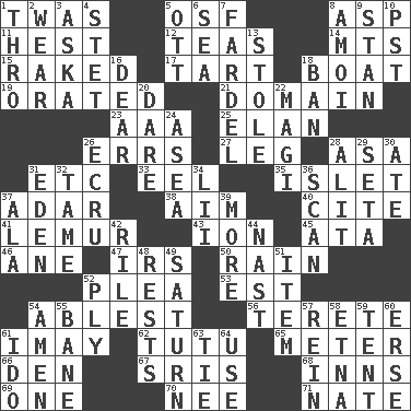 ACROSS 1. It was, poetically 5. Order of Saint Francis (abbr.) 8. Cleo's killer 11. Command 12. Afternoon social gatherings 14. Mountains (abbr.) 15. Moved through 17. Small pie 18. Water vessel 19. Declaimed 21. Realm 23. Auto club (abbr.) 25. Flair 26. Blunders 27. Part of a journey 28. White ___ sheet 31. And so on (abbr.) 33. Snakelike fish 35. Small island 37. The sixth month of the Jewish calendar 38. Direct toward a target or goal 40. Quote 41. Arboreal primate 43. Electrically charged atom 45. _ moment's notice (2 wds.) 46. A saturated hydrocarbon 47. Big collection agency 50. Precipitation 52. Entreaty 53. Eastern Standard Time (abbr.) 54. Most capable 56. Cylindrical with tapered ends 61. "If ____ say so..." 62. Ballerina skirt 65. Distance measurement 66. Lair 67. Indian titles of respect 68. Taverns 69. Single 70. Born 71. Nathan's nickname DOWN 1. Through, poetically 2. Put on (as clothing) 3. "____ silly question..." 4. Proofreading order 5. Baseball player Mel 6. Ocean 7. Bundle 8. Mine, in Marseilles 9. Comedian Laurel of Laurel & Hardy 10. Pacific Standard Time (abbr.) 13. Fur scarf 16. Letter starter 18. Forbid 20. Have the gumption 22. Wise men 24. At sea 26. Shade of tan 28. Set down 29. Stalk of a moss capsule 30. Had dinner 31. Paradise 32. Not wild 34. Cards in a Roman deck? 36. Examine hastily 37. Insect wing 39. Greater amount 42. Cause heat under the collar 44. Political cartoonist Thomas 48. Musical pauses 49. Titan orbits this 51. A distinct part 52. Apply oneself diligently 54. So be it 55. Object of repulsion 57. It's straight from the horse's mouth 58. Inactive volcano in Sicily 59. Portable shelter 60. Celtic language 61. Wedding promise 63. Neckwear 64. Purpose