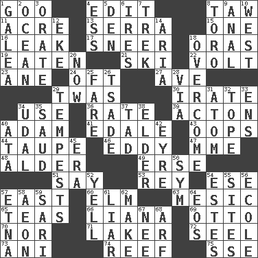 ACROSS 1. Thick or sticky substance 4. Prepare for publication 8. The 23rd letter of the Hebrew alphabet 11. Land measure 13. Spanish missionary in California 15. Single 16. Path through which fluid escapes 17. Scornful expression 18. Mouths or openings 19. Ingested 21. What Jean-Claude Killy likes to do 22. Electrical Unit 23. One (Scot) 24. Often (poetically) 27. "___ Maria" 29. It was, poetically 30. Feeling or showing extreme anger 34. Purpose 36. Pace 39. Gambison 40. First man 41. Peak District village in England 43. I made a mistake 44. Grayish beige 46. Whirlpool 47. Madame (abbr.) 48. Tree or shrub in the Birch family 49. Celtic language 51. Declare 53. Marina Del _, California 54. Compass dir. 57. Compass direction 60. Shade tree 63. Of or pertaining to a meson 65. Beverages made from leaves 66. Woody, climbing, usually tropical plant 69. Von Bismarck 70. And not 71. Member of a famous L.A. basketball team 72. Stitch closed the eyes of (a falcon) 73. Cuckoo 74. Coral collection 75. Compass dir. DOWN 1. An organ shaped like a helmet 2. Sea 3. Declaim 4. Curvy letter 5. Lair 6. Angers 7. Long journey 8. "Corrida" creature 9. Of or related to the anus 10. Compass direction 12. Supplement with great effort 14. Operatic vocal solo 18. Conquer 20. Immediately 25. Conductor's collection 26. Sadhe (variant) 28. By way of 29. Storms 31. Smallest unit of an element 32. Drink excessively 33. Followers of ems 34. Allodial 35. Saudi Arabian king (1953-1964) 37. Small boy 38. A person who is older than you are 40. _ moment's notice (2 wds.) 42. Jane of fiction 45. Period 50. Symbol (abbr.) 52. Shout 54. _____ Park, CO 55. Settings 56. Learning spot: Fr. 57. Inactive volcano in Sicily 58. Period of immesurable duration 59. Indian skirt 61. One who doesn't tell the truth 62. Create 64. Greek goddess of the dawn 67. Born 68. Sandy's bark
