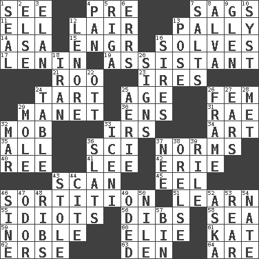 ACROSS 1. Observe 4. Before (prefix) 7. Sinks 11. Pipe bend 12. Den 13. Chummy 14. White ___ sheet 15. Engineer (abbr.) 16. Finds the solution 17. Soviet premier 1918-24 19. Helper 21. Friend of Pooh 23. Angers 24. Small pie 25. Personal question 26. Opposite of masc. 29. French painter Edouard 30. Followers of ems 31. Actress Charlotte 32. Disorderly crowd 33. Big collection agency 34. Tate display 35. Everything 36. _-fi 37. Typical models 40. To riddle 41. Area sheltered from the wind 42. One of the Great Lakes 43. Examine hastily 45. Snakelike fish 46. Determination 51. Memorize 55. Foolish or stupid persons 56. Rights 58. Ocean 59. Having high moral qualities 60. Writer Wiesel 61. Krazy ___ of comics 62. Celtic language 63. Lair 64. "We ___ not amused" (Victoria) DOWN 1. Lick closed 2. Otherwise 3. Enthusiasm 4. Baking dish 5. Capital of Latvia 6. Blunders 7. Table seasonings 8. Inventor's middle name 9. Small, secluded valley 10. System (abbr.) 12. Poe poem 13. Introduce or present, as a question 16. Founders of families 18. SW Asia republic 20. Attaches a signature 22. Baseball player Mel 24. Eating place 25. Nest on high 26. Movie unit 27. Hearing organs 28. Was introduced to 29. Undercover agent 32. Third mo. 33. Ancient Celtic tribe of eastern Britain 36. Narrow boards 37. Born 38. Threatening words 39. Cause heat under the collar 43. Took without asking 44. Quote 46. Trig term 47. Aroma 48. Teases 49. Wrote a lyric poem 50. The longest river in the world 52. "____ silly question..." 53. Tail end 54. Nathan's nickname 57. Storage container