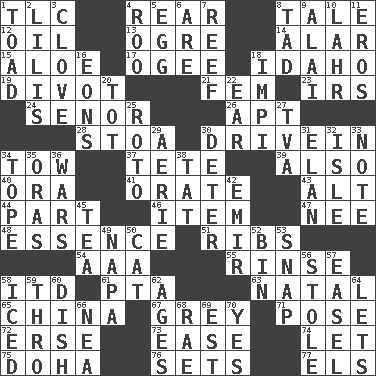 ACROSS 1. Affectionate concern, for short 4. Stern 8. Lie 12. Lubricate 13. Legendary monster 14. Having or resembling wings 15. Medicinal plant 17. Double curve, resembling the letter S 18. Potato state 19. A piece of turf (Scot.) 21. Opposite of masc. 23. Big collection agency 24. Sir (Sp.) 26. Fitting 28. Portico 30. Popular '50s hangout 34. Pull behind 37. Wig 39. In addition 40. Mouth or opening 41. Speak pompously 43. Keyboard modifier key 44. Component 46. A whole individual unit 47. Born 48. Gist 51. Teases 54. American Automobile Association (abbr.) 55. Remove soap 58. It would 61. Parent Teacher Assoc. 63. Relating to or accompanying birth 65. Large country 67. Jennifer or Joel 71. Airs 72. Celtic language 73. Comfort 74. Allow 75. Capital of the state of Qatar 76. Arranges properly for use 77. Raised railways DOWN 1. Frog relative 2. Ms. Damita and namesakes 3. Garlic unit 4. Friend of Pooh 5. Ovum 6. "We ___ not amused" (Victoria) 7. Coral ridge 8. Bit 9. Jai ____ 10. Cowardly lion portrayer 11. Greek god of love 16. Immeasurably long periods of time 18. Body of Kaffir warriors 20. Small child 22. Ewer handle 25. Printing process, for short 27. Federal power corp. 29. Nest on high 30. Prevent from occurring 31. Style 32. Capri or Wight 33. Observe 34. Drink excessively 35. Mouths or openings 36. Armed conflicts 38. Make lace 42. Independent ruler or chieftain 45. Afternoon social gathering 49. California wine valley 50. Domesticated feline 52. Storage container 53. Fastener 56. Took without asking 57. Artist's stand 58. On the rocks 59. Through, poetically 60. Food container 62. Eons 64. Allows 66. Teachers' org. 68. Actress Charlotte 69. Eastern Standard Time (abbr.) 70. It is so