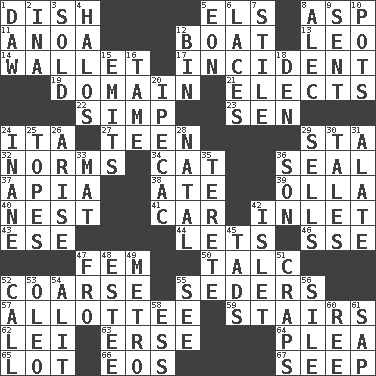 ACROSS 1. Food container 5. Raised railways 8. Cleo's killer 11. Small Philippine buffalo 12. Water vessel 13. Lion 14. Place for singles 17. Event 19. Realm 21. Opts 22. Simple or foolish person 23. Elected rep. 24. Call ___ day 27. Adolescent 29. R.R. building 32. Typical standards 34. Domesticated feline 36. Lick closed 37. Capital of Western Samoa 38. Had dinner 39. Water jar 40. A home for chicks 41. 4-wheeled motor vehicle 42. An arm off of a larger body of water 43. Compass dir. 44. Allows 46. Compass dir. 47. Opposite of masc. 50. Baby powder 52. Rough 55. Spring feasts 57. One to whom something is allotted 59. Flight of steps 62. Luau accessory 63. Celtic language 64. Entreaty 65. Car dealer's back yard 66. Greek goddess of the dawn 67. Ooze DOWN 1. Simpleton 2. _ tizzy (2 wds.) 3. Exchanged or delivered for money 4. Radiant circles of light 5. Period of immesurable duration 6. Shoestrings 7. Vertical member of a panel or frame 8. Actor Baldwin 9. Posted 10. Plant holders 12. Storage container 15. Sends forth 16. Not wild 18. Lair 20. Medicinal drug used to evoke vomiting 24. Empty; void 25. Drinks excessively 26. Originate 28. Relating to or accompanying birth 29. Exchanges for money 30. Lies 31. Having winglike extensions 33. Floor covering 35. Cigar-shaped 36. Boy, to dad 42. Small island 45. Small boys 47. From 48. First name in cosmetics 49. Paris' subway 51. Dice game 52. Give a ring to 53. Butter sub 54. Came down and settled, as after flight 55. Observe 56. Filth; sediment 58. Curvy letter 60. Portuguese money of account (variant) 61. Plant excrement