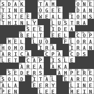 ACROSS 1. Neighbor of Neb. 5. Scottish cap 8. Single 11. Prong on a fork 12. Double curve, resembling the letter S 14. One of the 12 tribes of Israel 15. First name in cosmetics 17. Welt 18. Charged atoms 19. Without thickness 21. A period of five years 23. Perceive with the eye 25. The main thing one is thinking about 26. Waist strap 27. Snakelike fish 28. Police officer (slang) 31. Cartoonist voice _ Blanc 33. Nilotic language 35. Plants 37. Same (prefix) 38. Retirement account (abbr.) 40. SW Asia republic 41. N. Chile seaport 43. Accounting whiz (abbr.) 45. Music discs 46. Allow 47. Head covering 50. Capri or Wight 52. Type of rug 53. Alias (abbr.) 54. Spring feasts 56. Electrical Unit 61. Disposed of to a purchaser 62. Slanted text style (abbr.) 65. Having ears or earlike features 66. Wing 67. Suggestive of the supernatural 68. Actor's bit 69. Fenced enclosure 70. Area sheltered from the wind 71. Count _ (2 wds.) DOWN 1. Proofreading order 2. Food container 3. Against 4. Peachy ____! 5. Pull behind 6. Personal question 7. Ear of corn 8. Scent 9. Nanny 10. Followers of ems 13. Dodge 16. Otherwise 18. Call ___ day 20. Shout 22. Itself 24. Needle holder 26. Coalition 28. Drawstring 29. Mouths or openings 30. Baking dish 31. Greater amount 32. Give off 34. The grampus (Milton) 36. Louse (plural) 37. Actor Linden 39. Capital of Western Samoa 42. Land measure 44. "____ silly question..." 48. Nest on high 49. Soft color 51. Unable to walk 52. Find the sum of 54. Not divided or shared with others 55. Liveliness 57. Inside of hand 58. 4th largest of the Great Lakes 59. Painter Guido (1575-1642) 60. Paradise 61. Plant excrement 63. "We ___ not amused" (Victoria) 64. Sodium hydroxide