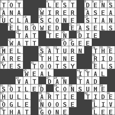 ACROSS 1. Small child 4. For fear that 8. Lairs 12. Santa ___, CA 13. One who wires 14. Toward the sea 15. Southern CA. univ. 17. Biscuitlike quick bread 18. Comedian Laurel of Laurel & Hardy 19. Shoved, as through a crowd 21. Artist's stands 23. Make lace 24. Nine, plus one 26. Pass on 27. Electrical Unit 28. Double curve, resembling the letter S 30. Cartoonist voice _ Blanc 31. Titan orbits this 34. Definite Article 37. "We ___ not amused" (Victoria) 38. One or ones belonging to thee 39. To free from 40. It is so 41. A girl or young woman (variant) 42. Raised railways 43. Welt 44. Slanted text style (abbr.) 46. Large container 47. Daniel's nick name 50. Bit 51. Dirtied 54. Ingest 57. Frame or body of a ship 58. Nick name for Arthur 60. Periodic rise and fall of the sea level 62. Stare 63. Trap for birds or small mammals 64. 54 in ancient Rome 65. Not this but _ 66. Went 67. Area sheltered from the wind DOWN 1. The 19th letter of the Greek alphabet 2. At one time in the past 3. Baron Munchausen's specialties 4. It is permitted: Lat. 5. Wear away 6. Elected rep. 7. Woody plant 8. Hyrax 9. First name in cosmetics 10. Anneal 11. Without 13. Compass dir. 16. Blind as ____ 20. Baseball player Mel 22. Arabian gulf 25. Parts of speech 27. We are 29. Jennifer or Joel 30. Can I? 31. Portico 32. Hold, grip (Informal) 33. Teat (slang) 34. Excercise machine 35. Land elevation 36. Begley and Asner 41. False hair 43. Place for singles 44. ___ a Wonderful Life 45. Strained 46. Country residence 48. 13-14th century defensive garment 49. Annoying sound 51. Opportunity 52. Ending for "Through" and "Enough" 53. Mild oath, euphamism for damn 55. Born 56. Singer Brickell 59. Friend of Pooh 61. Night before a holiday