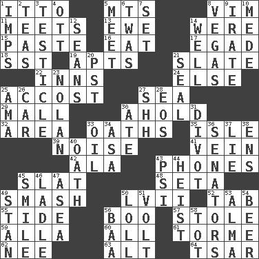 ACROSS 1. "Tell ____ the Marines!" 5. Mountains (abbr.) 8. Zeal 11. Confronts 13. She-sheep 14. Past tense of be (plural) 15. Thick mixture 16. Ingest 17. Mild oath 18. Fast jet (abbr.) 19. Flats, for short 21. Schedule 22. Restaurants 24. Otherwise 25. Buttonhole 27. Ocean 29. Shopping center 30. Hold, grip (Informal) 32. Type of rug 33. Expletives 35. Capri or Wight 39. Annoying sound 41. Distinctive style or manner 42. Wing 43. Gives a jingle 45. Narrow board 48. Stalk of a moss capsule 49. Box-office sellout 50. 57 in ancient Rome 52. Keyboard key 55. Periodic rise and fall of the sea level 56. Sometimes accompanies a hiss 57. Took without asking 59. Silent film actress Nazimova 60. 100% 61. Singer Mel 62. Born 63. Keyboard modifier key 64. Russian ruler of old DOWN 1. Naughty children 2. Beverages made from leaves 3. A testis 4. Baseball player Mel 5. Rendezvous 6. It was, poetically 7. Arrange properly for use 8. Viva Las _ 9. Feeling or showing extreme anger 10. Ancient Persian 12. Actors Connery and Penn 14. Not ill 20. Pacific Standard Time (abbr.) 21. Lick closed 23. Pitcher Ryan 25. Nursemaid (var.) 26. Auto 27. Quiet! 28. Greek goddess of the dawn 30. Had dinner 31. A piece of turf (Scot.) 33. Lubricate 34. White ___ sheet 36. Elected representatives 37. Whopper 38. Followers of ems 40. Pledge 43. Air pressure measure (abbr.) 44. Robbery 45. Grin 46. Dipping utensil 47. Toward the sea 49. Comedian Laurel of Laurel & Hardy 50. Hang loosely or laxly 51. Electrical Unit 53. _ mater 54. Fermented drink made from hops 56. Sound made by sheep 58. Small child