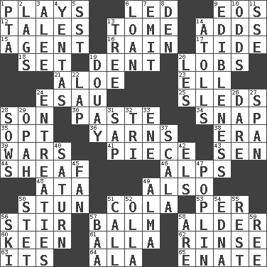ACROSS 1. Frolics 6. Directed 9. Greek goddess of the dawn 12. Lies 13. Heavy book 14. Sums up 15. Representative 16. Precipitation 17. Periodic rise and fall of the sea level 18. Put into a specified state 19. Gouge 20. Tennis shots 21. Medicinal plant 23. Pipe bend 24. Son of Isaac 25. Bobsleighs 28. Male child 30. Thick mixture 34. Fastener 35. Choose 36. Entertaining tales 38. Period 39. Armed conflicts 41. Component 43. Elected rep. 44. Bundle of cut stalks of grain 46. High mountains 48. "One Day ___ Time" 49. In addition 50. Surprise greatly 51. Root beer relative 53. For each 56. Tumult 57. Lip ointment 58. Tree or shrub in the Birch family 60. Peachy ____! 61. Silent film actress Nazimova 62. Wash lightly 63. It is 64. Insect wing 65. Related on the mother's side DOWN 1. Parent Teacher Association (abbr.) 2. Fails to keep up a pace 3. Toward shelter 4. Gossips 5. Fast jet (abbr.) 6. Grant temporary use of 7. Give off 8. Lair 9. The property of being fit to eat 10. Probability 11. Compass dir. 13. Family _ (genealogy) 14. Ringlike coral islands and reefs 19. A city in N France, SE of Calais 20. French article 22. Pet locale 24. Pleas 26. Have the gumption 27. Connect, as a bridge 28. Sty mamas 29. Brightly colored fish 31. Plant excrement 32. Three (prefix) 33. Compass dir. 37. Any of the three canals of the cochlea 40. Titan orbits this 42. Raised railways 45. Air blower 47. Cotton for raincoats, e.g. 49. _ mater 50. Proofreading order 51. Give a ring to 52. Rounded earthenware pot or jar 54. Pulitzer Prize-winning author Ferber 55. Take ten 56. What Jean-Claude Killy likes to do 57. Sound made by sheep 58. "We ___ not amused" (Victoria) 59. To riddle