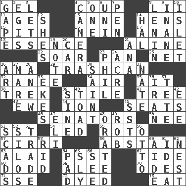 ACROSS 1. Set 4. Clever action or accomplishment 8. Cards in a Roman deck? 11. Grows older 13. Queen of England 1702-14 14. Coop moms 15. Heart or essence 16. Chow _ 17. Of or related to the anus 18. Core 21. Place in a line 22. Fly high 23. Baking dish 25. Remaining after all deductions 26. Nanny (var.) 29. File 13 32. The wife of a rajah (variant) 34. Wind 35. Small island 38. Long journey 39. Vertical member of a panel or frame 41. Family _ (genealogy) 43. She-sheep 44. Electrically charged atom 45. Theater features 46. Legislators 50. Born 51. Fast jet (abbr.) 54. Directed 55. Printing process, for short 57. High-altitude cloud 59. Refrain by choice 63. Mountain range southwest of Kyrgyzstan 64. Inconspicuous attention getter 67. Event that recurs at intervals 68. Texas town _ City 69. Toward shelter 70. Lyric poems 71. Compass dir. 72. Colored 73. Erode DOWN 1. Yawn 2. Armor plate that protects the chest 3. Allows 4. Device for capturing images 5. Single 6. University (slang) 7. Animal enclosure 8. Soviet premier 1918-24 9. Lacking in sense or substance 10. Small island 12. "______ My Girl" (Turtles hit) 14. Actor Linden 19. Short letter 20. Auto 21. Santa ___, CA 23. Silvers or Donahue 24. Land measure 26. Tate display 27. Female horse 28. Afresh 30. Inhabitant of Heaven 31. Nathan's nickname 33. Supplements with great effort 36. SW Asia republic 37. False hair 39. Trig term 40. Frog relative 42. Compass dir. 45. Fast planes 47. Connecticut Ivy Leaguer 48. Spoke pompously 49. Director Reiner 51. Loads 52. Grain storage towers 53. Exchange 56. "Beetle Bailey" pooch 58. To free from 60. Helper 61. It may be bright or harebrained 62. Egg locale 64. Groovy apt. 65. Insidious 66. Observe