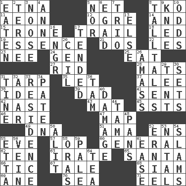 ACROSS 1. Inactive volcano in Sicily 5. Fish or hair follower 8. Ring climax 11. A really long time 12. Legendary monster 14. Added to 15. Heavy duty weighing machine 17. Hang back 18. Directed 19. Substance 21. Two (Sp.) 22. French article 23. Born 24. Commissioned military rank (abbr.) 25. Consume 27. To free from 28. Floor coverings 31. Canvas cover 35. Allow 37. Toward shelter 38. The main thing one is thinking about 39. Male parent 41. Transmitted 42. Political cartoonist Thomas 43. Floor covering 45. Fast planes 46. 4th largest of the Great Lakes 47. Atlas unit 49. Heredity factor (abbr.) 51. Nursemaid (var.) 52. Followers of ems 55. Night before a holiday 57. Chop off 60. Commissioned military rank 62. "___ Little Indians" 63. Feeling or showing extreme anger 65. Before Barbara or Clara 66. Nervous spasm 67. Lie 68. Thailand, formerly 69. One (Scot) 70. Ocean 71. Snakelike fish DOWN 1. Consumed 2. Laconic 3. Trap for birds or small mammals 4. Singer Murray 5. And not 6. Mild oath 7. Musical group of three 8. Baron Munchausen's specialties 9. Leg joint 10. Likelihood 13. Otherwise 16. Engineer (abbr.) 17. Looked after 20. To provide with a ceiling 26. Collect or gather 29. Portable shelter 30. Puts into a specified state 31. Prong on a fork 32. The sixth month of the Jewish calendar 33. Dwelling 34. Eucharist need 36. Scottish cap 40. Break 44. Docile 48. Baking dishes 50. Set down 52. Bert's buddy 53. Brizilian seaport 54. Criticizes harshly 55. Singer James 56. Distinctive style or manner 58. Mouths or openings 59. Light colored 61. Relaxation 64. Afternoon social gathering