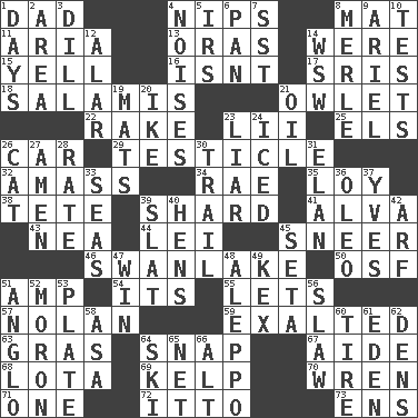 ACROSS 1. Male parent 4. Cuts off 8. Floor protector 11. Operatic vocal solo 13. Mouths or openings 14. Past tense of be (plural) 15. Shout 16. Is not 17. Indian titles of respect 18. Deli grouping 21. A small or young owl 22. Immoral or dissolute person 23. Cards in a Roman deck? 25. Raised railways 26. Auto 29. One of the two male reproductive glands 32. Collect or gather 34. Actress Charlotte 35. Myrna of the movies 38. False hair 39. Pottery fragment 41. Inventor's middle name 43. Teachers' org. 44. Flowery wreath 45. Scornful expression 46. Tchaikovsky ballet 50. Order of Saint Francis (abbr.) 51. Electrical Unit 54. ___ a Wonderful Life 55. Allows 57. Pitcher Ryan 59. Glorified 63. Pate de foie ____ 64. Fastener 67. Assistant 68. Globular water bottle used in Asia 69. Seaweed 70. Songbird 71. Single 72. "Tell ____ the Marines!" 73. Followers of ems DOWN 1. 24-hour periods 2. Type of rug 3. Deli pickle 4. Annoying sounds 5. Big collection agency 6. Baking dish 7. Fast jet (abbr.) 8. Haggard of country music 9. Satellite of Uranus 10. Trials 12. Having or resembling wings 14. Compass dir. 19. Floor coverings 20. Eisenhower's nickname 21. Petroleum 23. One who doesn't tell the truth 24. On the rocks 26. Domesticated feline 27. So be it 28. Assign a rank or rating to 30. Lag or linger behind 31. Flair 33. Oceans 36. Butter sub 37. Jacques Cousteau's middle name 39. Narrow board 40. Coop moms 42. Sandy's bark 45. Bristle 47. Acquire through effort 48. City in Syria 49. Dry husk or covering 51. White American of non-Hispanic descent 52. Person of subnormal intelligence 53. Food holder 56. Cole _ (cabbage dish) 58. White ___ sheet 60. Hoop that covers a wheel 61. Paradise 62. Hiding places for outlaws 64. What Jean-Claude Killy likes to do 65. Fish or hair follower 66. Keyboard modifier key