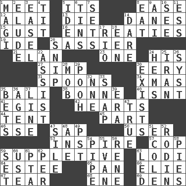 ACROSS 1. Rendezvous 5. ___ a Wonderful Life 8. Comfort 12. Mountain range southwest of Kyrgyzstan 13. Pass on 14. Natives or inhabitants of Denmark 15. Abrupt rush of wind 16. Pleas 19. Binary compound 20. More disrespectful 21. Flair 23. Single 24. Part of HMS, perhaps 27. Simple or foolish person 30. Suggestive of the supernatural 31. Soup utensils 34. Dec. holiday 35. Indonesian resort city 38. Maid-servant 40. Is not 41. The front part of a cuirass 42. Centers of feelings and intuitions 44. Portable shelter 45. Component 46. Compass dir. 47. Plant excrement 50. One who makes use of a thing 53. Heighten or intensify 57. Police officer (slang) 59. Supplying deficiencies 63. Farming town in central California 64. First name in cosmetics 65. Baking dish 66. Writer Wiesel 67. Pull apart 68. Compass dir. 69. Lairs DOWN 1. Wise men 2. Dodge 3. Artist's stand 4. Teat (slang) 5. The main thing one is thinking about 6. Metal containers 7. Puts into a specified state 8. Ingest 9. Cuckoo 10. Observe 11. Double-curved letter 14. Have the gumption 17. _ de Janeiro 18. Car or cant ending 20. Clip 22. Aid 24. Cloth borders 25. SW Asia republic 26. System (abbr.) 28. Crowd into 29. "Silly old bear" 30. Is 32. Compass dir. 33. Fastener 35. Antes 36. Ripens 37. Actor's bit 39. Epoch 43. Loyal 47. Drop; flow; fall 48. One (Scot) 49. Pacific Standard Time (abbr.) 51. Learning spot: Fr. 52. "The Thinker" sculptor 54. Corncob 55. "Terrible" tsar 56. French philosopher Descartes 58. Sliced desserts 59. Put into a specified state 60. Purpose 61. Parent Teacher Association (abbr.) 62. For each 63. Directed