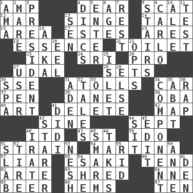ACROSS 1. Electrical Unit 4. Letter starter 8. Go away! 12. Make imperfect 13. Burn superficially 14. Lie 15. Type of rug 17. _____ Park, CO 18. Ancient Greek god of war 19. Center 21. Bathroom 23. Mamie's husband 24. Indian title of respect (Mr.) 26. Adept person 27. Allodial 28. Arranges properly for use 30. Compass dir. 31. Ringlike coral islands and reefs 34. Automobile 37. Animal enclosure 38. Natives or inhabitants of Denmark 39. Chief or king in Benin or Nigeria 40. Nonscientific branch of learning 41. Keyboard key 42. Atlas unit 43. Trig term 44. Back-to-school mo. 46. It would 47. Fast jet (abbr.) 50. Wedding promise 51. Put through a sieve 54. Chrissie's court nemesis 57. One who doesn't tell the truth 58. 1973 Nobel Price Winner (Physics) Leo 60. Look after 62. Johnson of "Laugh-In" 63. Fragment 64. Compass dir. 65. Fermented drink made from hops 66. Equivocates 67. "___ Little Indians" DOWN 1. Housemaid (var.) 2. Female horse 3. Elected leader of a country 4. Plates 5. Keyboard key 6. Mature 7. Take ten 8. Flight of steps 9. Monte _, Las Vegas Hotel/Casino 10. Toward shelter 11. Trial 13. Elected rep. 16. "____ silly question..." 20. Snakelike fish 22. Chooses 25. Small island 27. One who makes use of a thing 29. Otherwise 30. Health resort 31. Arabian gulf 32. Stories 33. Single 34. Part 35. Blind as ____ 36. Strike 41. "You Light Up My Life" star Conn 43. A viewer who gazes fixedly 44. Be seated 45. Prepare for publication 46. Feeling or showing extreme anger 48. Excessive but superficial compliments 49. Receives possession of 51. Thick slice 52. Hoop that covers a wheel 53. Tender 55. To free from 56. Singer Murray 59. A female animal or person 61. Lair