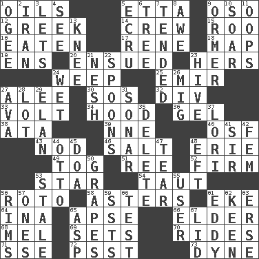 ACROSS 1. Petroleums 5. Singer James 9. Bear (Spanish) 12. Hellenic 14. Ship's personnel 15. Friend of Pooh 16. Eroded 17. French philosopher Descartes 18. Atlas unit 19. Followers of ems 20. Took place subsequently 23. Possessive pronoun 24. Shed a tear 25. Independent ruler or chieftain 27. Toward shelter 30. Distress signal 32. HTML Container Element 33. Electrical Unit 34. Parka part 36. Set 38. _ moment's notice (2 wds.) 39. Compass dir. 40. Order of Saint Francis (abbr.) 43. Lower and raise head in agreement 46. Table seasoning 48. 4th largest of the Great Lakes 49. Coat; cloak 51. To separate or throw off 52. Securely fixed in place 53. Play the lead 54. Strained 56. Printing process, for short 58. Michaelmas daisies 61. Supplement with great effort 64. _ tizzy (2 wds.) 65. Domed church section 66. A person who is older than you are 68. Cartoonist voice _ Blanc 69. Puts into a specified state 70. Amusement-park features 71. Compass dir. 72. Inconspicuous attention getter 73. Centimeter-gram-second unit of force DOWN 1. Double curve, resembling the letter S 2. SW Asia republic 3. Allows 4. Perceive with the eye 5. Shade of tan 6. Family _ (genealogy) 7. Looked after 8. Deep reverence 9. Abalone 10. Fly high 11. I made a mistake 13. Leg joint 21. Delicate 22. Soup utensils 23. Hub of activity 24. Soggy 26. Russian fighter aircraft 27. Actress Gardner 28. Car dealer's back yard 29. Flair 31. Underwater navigation system 35. Erase 37. Australian parrot (variant) 41. Title for a knight 42. Opposite of masc. 44. "Beetle Bailey" pooch 45. ___ good deed 47. Separate forcefully 48. Newt 50. Wine fruits 53. Lacking originality or spontaneity 55. One who makes use of a thing 56. Basketball hoops 57. Singles 59. Fast planes 60. Trial 61. Whirlpool 62. Peachy ____! 63. Celtic language 65. Viper 67. Flaplike covering