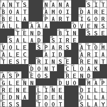 ACROSS 1. Pismires 5. Grandmother 9. Be seated 12. Water vessel 13. Mine, in Marseilles 14. Have the gumption 15. Actor Lugosi 16. Component 17. Russian composer Stravinsky 18. Everything 19. Auto club (abbr.) 21. Baking chambers 22. Watch over 24. Storage container 26. Compass dir. 27. Vegetable dish 28. Beget 29. Short-tailed, large-bodied rat 30. Practice fights 32. Smallest unit of an element 36. Actor Baldwin 37. Assist 38. Operatic vocal solo 39. Trial 40. Remove soap 42. Monthly bill 43. Do not 44. Anything that covers or conceals 46. Cleo's killer 49. Greek goddess of the dawn 50. Tear apart 51. American astronaut and politician John 53. Superhero pair 54. Atlas unit 57. French philosopher Descartes 58. Actor's bit 61. Deli pickle 62. Pulitzer Prize-winning author Ferber 63. Paradise 64. Spanish pot 65. Curvy letter 66. A blast of a horn 67. Kill DOWN 1. Swedish rock group 2. Christmas carol 3. Baron Munchausen's specialties 4. R.R. building 5. California wine valley 6. Nursemaid (var.) 7. And not 8. Small island 9. Gurus 10. Metal shackles 11. Laconic 14. HTML Container Element 19. Santa ___, CA 20. Sums up 21. Single 23. Voters do this 24. Avian creatures 25. Big collection agency 27. Not divided or shared with others 28. Inhabitant of Heaven 29. Large container 31. Aches 32. Composer Copland 33. Excercise machine 34. Pig sound 35. Floor protector 40. Friend of Pooh 41. Shade of tan 43. Lair 45. Lion 46. Match 47. Bobsleighs 48. Actor Sean's family 52. Teachers' org. 53. Undesirable depression on a surface 55. Silent film actress Nazimova 56. Romp 58. Allow 59. Wedding promise 60. Modern: prefix 61. Two (Sp.)