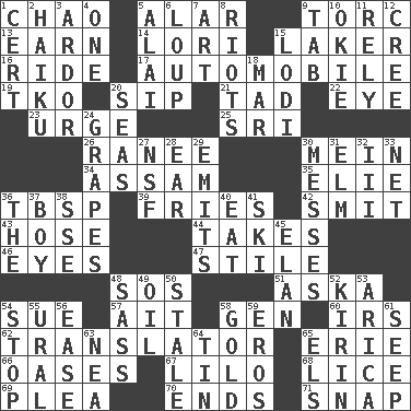 ACROSS 1. US Secretary of Labor Elaine L. _ 5. Having or resembling wings 9. Torque (variant) 13. Merit 14. Australian parrot (variant) 15. Member of a famous L.A. basketball team 16. Travel on or in a vehicle 17. Form of transportation 19. Ring climax 20. Small drink 21. Small boy 22. Sight organ 23. Goad 25. Indian title of respect (Mr.) 26. Indian princess (variant) 30. Count _ (2 wds.) 34. Indian state 35. Writer Wiesel 36. Cook's measure (abbr.) 39. Strips of potato fried in deep fat 42. Stricken, poetically 43. Flexible conduit 44. Receives possession of 46. Sight organs 47. Vertical member of a panel or frame 48. Mayday 51. "____ silly question..." 54. Institute legal proceedings 57. Small island 58. Commissioned military rank (abbr.) 60. Big collection agency 62. Interpreter 65. 4th largest of the Great Lakes 66. Fertile tracts in a desert 67. _ and Stitch 68. Louse (plural) 69. Entreaty 70. Extremities 71. Fastener DOWN 1. Foregone conclusion 2. Japanese verse 3. Zeal 4. Single 5. Jai ____ 6. Central Nebraska county 7. Tate display 8. Debaucheries 9. Bar bill 10. Migrant worker of the '30s 11. Trust 12. Algonquian 15. Farming town in central California 18. Spoil 20. Oceans 24. Raisin fruits 27. Overdraft (abbr.) 28. Hearing organ 29. Sends forth 30. Makes clutter 31. Shade tree 32. One more than two 33. Fish or hair follower 36. Definite Article 37. Male child 38. Compass dir. 40. Ingest 41. What Jean-Claude Killy likes to do 45. Style 48. Backtalk 49. Petroleum 50. Lacking originality or spontaneity 52. Japanese brewing company 53. N. Chile seaport 54. Halt 55. Mountain range 56. Relaxation 58. Aureate 59. Greek god of love 61. Ooze 63. Teachers' org. 64. Shallow baking pan 65. Raised railways
