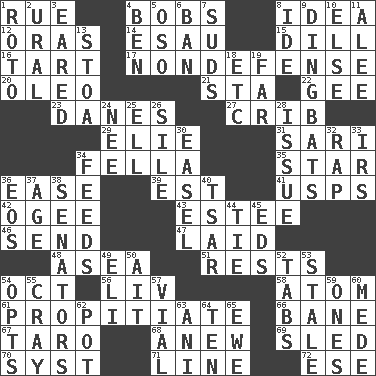 ACROSS 1. Sorrow 4. Moves up and down 8. The content of cognition 12. Mouths or openings 14. Son of Isaac 15. Deli pickle 16. Small pie 17. Unrelated to defense, as in spending 20. Butter sub 21. R.R. building 22. Unit of force equal to gravity 23. Natives or inhabitants of Denmark 27. Baby bed with high sides 29. Writer Wiesel 31. Indian skirt 34. Chap (slang) 35. Play the lead 36. Relaxation 39. Eastern Standard Time (abbr.) 41. United States Postal Service (abbr.) 42. Double curve, resembling the letter S 43. First name in cosmetics 46. Post 47. Put down 48. Toward the sea 51. Musical pauses 54. Sep. follower 56. 54 in ancient Rome 58. Smallest unit of an element 61. Conciliate 66. Object of repulsion 67. Pacific island yam 68. Afresh 69. Downhill vehicle 70. System (abbr.) 71. Actor's bit 72. Compass dir. DOWN 1. Printing process, for short 2. Mountain range 3. Having ears or earlike features 4. Benjamin's nick name 5. Bear (Spanish) 6. Forbid 7. Beer foam 8. Binary compound 9. Empty-headed or silly people 10. Otherwise 11. Toward shelter 13. Portico 18. And so on (abbr.) 19. At a great distance 24. Born 25. Pipe bend 26. Drop; flow; fall 28. Come out of 30. Artist's stand 32. Strike 33. Big collection agency 34. Gives food to 36. Greek goddess of the dawn 37. Ripen 38. Elected representatives 40. Russian ruler of old 44. Make a knot 45. Begley and Asner 49. Connecticut Ivy Leaguer 50. Small island 52. Bar bills 53. Showing deterioration from age 54. Chooses 55. Supercomputer manufacturer 57. Small bottle 59. Singles 60. Ancient Persian 62. Cooking vessel 63. Black tropical American cuckoo 64. Nine, plus one 65. She-sheep