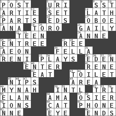 ACROSS 1. Mail 5. RI univ. 8. Fast jet (abbr.) 11. Nick name for Arthur 13. Put into a specified state 14. Thin strip of wood or metal 15. Components 16. Begley and Asner 17. Mitch Miller's instrument 18. Santa ___, CA 19. "Corrida" creature 21. Lightheartedly 22. Adolescent 24. Queen of England 1702-14 25. Main course 27. Portuguese money of account (variant) 29. A really long time 30. Man or boy (slang) 32. Painter Guido (1575-1642) 33. Live dramatic performances 35. Genesis locale 39. Keyboard key 41. French philosopher Descartes 42. Erode 43. Rest room 45. Cuts off 48. Length times width 49. Non-adult bird? 50. International (abbr.) 52. Three (prefix) 55. Liveliness 56. Nursemaid (var.) 57. Flexible twig of a willow tree 59. Charged atoms 60. Domesticated feline 61. Give a jingle 62. Compass dir. 63. Sight organ 64. Extremities DOWN 1. Dad 2. NW Algerian seaport 3. Ski resort town in Vermont 4. Teat (slang) 5. One who makes use of a thing 6. Make new 7. It is 8. Unit of acoustic absorption 9. Took without asking 10. Those things 12. First name in cosmetics 14. Grant temporary use of 20. Single 21. Highlander 23. Bert's buddy 25. Hearing organ 26. Born 27. Marina Del _, California 28. Raised railways 30. Distant 31. Nest on high 33. Parent Teacher Assoc. 34. Allow 36. Accusation by an informer 37. Compass dir. 38. Fish or hair follower 40. Tender 43. Make lace 44. Fourth or lowest deck 45. High-strength synthetic material 46. Lacking in sense or substance 47. Zero-star reviews 49. Chow _ 50. "If ____ say so..." 51. Nathan's nickname 53. Tear apart 54. Angers 56. Adept person 58. A female animal or person