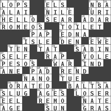 ACROSS 1. Chops off 5. Raised railways 8. Basketball assoc. 11. Mountain range southwest of Kyrgyzstan 12. "Death on the ____" 14. RI univ. 15. Phone greeting 17. Wither 18. The sixth month of the Jewish calendar 19. Lover boys 21. Bathroom plumbing fixture 23. Infant food 25. Pulitzer Prize-winning author Ferber 26. Small island 27. Lair 28. She-sheep 31. Nine, plus one 33. Make lace 35. Unit of acoustic absorption 37. Oneself 38. Strike 40. Grand slam 41. Mexican monetary units 43. Armed conflict 45. Working for oneself (abbr.) 46. A saturated hydrocarbon 47. Groovy apt. 50. Tear apart 52. Billionth: prefix 53. Third day of the wk. 54. Declaimed 56. Greek mezzo-soprano Agnes 61. A hard, heavy blow 62. Eras 65. Failure 66. Snakelike fish 67. San ____ (Riviera town) 68. Nathan's nickname 69. Personal question 70. Player for Phoenix 71. Pate de foie ____ DOWN 1. Cowardly lion portrayer 2. Butter sub 3. Inside of hand 4. Filth; sediment 5. Followers of ems 6. Whopper 7. Scheduled 8. Naked 9. Naughty child 10. Atmosphere 13. Eat (away) 16. I made a mistake 18. Insect wing 20. Table seasoning 22. Taverns 24. Lightbulb-shaped fruit 26. Information 28. Inky black, to poets 29. Rampant 30. Compass dir. 31. Adolescent 32. Otherwise 34. The 23rd letter of the Hebrew alphabet 36. Enthusiastic 37. Health resort 39. Component 42. Petty quarrel 44. Reuben's nickname 48. Approach 49. Evades 51. Be tempered by heat 52. Tired old horse 54. Cassini of fashion 55. Court order 57. Having great length 58. Russian ruler of old 59. Stalk of a moss capsule 60. Ancient Greek god of war 61. Ocean 63. Australian flightless bird 64. Male child