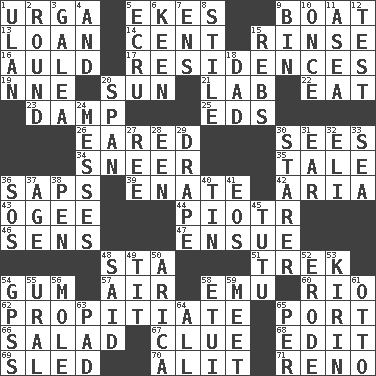 ACROSS 1. Capital and largest city of Mongolia 5. Supplements with great effort 9. Water vessel 13. Grant temporary use of 14. Penny 15. Remove soap 16. Old (Scot.) 17. Homes 19. Compass dir. 20. Player for Phoenix 21. Experiment locale 22. Ingest 23. Moist 25. Begley and Asner 26. Having ears or earlike features 30. Perceives with the eye 34. Contemptuous expression 35. Story 36. Plant excrements 39. Maternal 42. Roberta Peters solo 43. Double curve, resembling the letter S 44. Peter (Polish) 46. Elected reps. 47. Follow as a consequence or result 48. R.R. building 51. Long journey 54. Chewing product 57. Wind 58. Australian flightless bird 60. River (Sp.) 62. Appease 65. Sweet dark-red dessert wine 66. Vegetable dish 67. A slight indication 68. Prepare for publication 69. Downhill vehicle 70. Came down and settled, as after flight 71. Former U.S. Attorney General Janet DOWN 1. Uhlan (variant) 2. One shot 3. An organ shaped like a helmet 4. Plus 5. Shade of tan 6. Peachy ____! 7. Followers of ems 8. Vertical member of a panel or frame 9. Storage container 10. Single time 11. Toward the sea 12. Trial 15. Confederate soldiers (slang) 18. June honoree 20. Connect, as a bridge 24. Makes clutter 27. To separate or throw off 28. Car or cant ending 29. Window treatment 30. A viewer who gazes fixedly 31. Hearing organ 32. Biblical high priest 33. Ocean 36. Mayday 37. Personal question 38. Writing instrument 40. Shallow baking pan 41. Greek goddess of the dawn 45. Ballerina skirt 48. Expressed in words 49. Teat (slang) 50. N. Chile seaport 52. Wear away 53. Japanese brewing company 54. Global Positioning Systems (abbr.) 55. Mountain range 56. Undercover agent 58. Needle holder 59. Rendezvous 61. "Beetle Bailey" pooch 63. Groovy apt. 64. Everything 65. For each