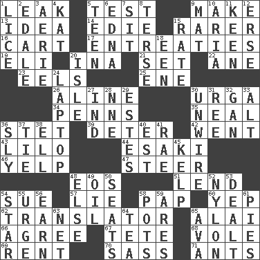 ACROSS 1. Path through which fluid escapes 5. Trial 9. Create 13. The content of cognition 14. Singer Brickell 15. More uncommon 16. Haul 17. Pleas 19. Connecticut Ivy Leaguer 20. _ tizzy (2 wds.) 21. Put into a specified state 22. One (Scot) 23. Snakelike fish 25. Compass dir. 26. Place in a line 30. Capital and largest city of Mongolia 34. Actor Sean's family 35. Be tempered by heat 36. Proofreading order 39. Prevent from occurring 42. Left 43. _ and Stitch 44. 1973 Nobel Price Winner (Physics) Leo 46. Sharp bark 47. Guide 48. Greek goddess of the dawn 51. Grant temporary use of 54. Institute legal proceedings 57. Untruth 58. Infant food 60. Slangy assent 62. Interpreter 65. Jai ____ 66. Match 67. Wig 68. Short-tailed, large-bodied rat 69. Monthly bill 70. Backtalk 71. Pismires DOWN 1. Louse (plural) 2. Peak District village in England 3. Nest on high 4. Krazy ___ of comics 5. Adolescent 6. Pulitzer Prize-winning author Ferber 7. Be seated 8. Laconic 9. Floor protector 10. Roberta Peters solo 11. Peachy ____! 12. Celtic language 15. Pace 18. Car or cant ending 20. Capri or Wight 24. Portable computer 27. Working for oneself (abbr.) 28. Compass dir. 29. _____ Park, CO 30. Undo the wiring of 31. To sift 32. Separate the seeds from cotton 33. The first octave above the treble staff 36. Playfully artful 37. Standoff 38. Pipe bend 40. Eastern Standard Time (abbr.) 41. Actress Charlotte 45. Seaweed 48. Otherwise 49. Petroleum 50. Theater features 52. High-strength synthetic material 53. Started a card game 54. Play the lead 55. Goad 56. Merit 58. Plant holders 59. Ancient Greek god of war 61. Sliced desserts 63. Fish or hair follower 64. Afternoon social gathering 65. Actress Gardner