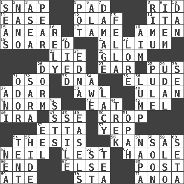 ACROSS 1. Fastener 5. Writing tablet 8. To free from 11. Comfort 12. Norwegian king 14. Call ___ day 15. Approach 17. Not wild 18. So be it 19. Flew 21. Plant genus of onion and garlic 23. Falsehood 25. Seize upon or latch onto something 26. Colored 27. Ewer handle 28. Product of festering 31. Bear (Spanish) 33. Heredity factor (abbr.) 35. Dodge 37. The sixth month of the Jewish calendar 38. Leather borer 40. ____ Bator 41. Typical standards 43. Erode 45. Cartoonist voice _ Blanc 46. Lyricist Gershwin 47. Compass dir. 50. Riding implement 52. Singer James 53. Slangy assent 54. College paper 56. Sunflower state 61. Famous astronaut Armstrong 62. For fear that 65. White Person, in Hawaii 66. Conclusion 67. Otherwise 68. Mail 69. Had dinner 70. R.R. building 71. Small Philippine buffalo DOWN 1. Oceans 2. Billionth: prefix 3. At sea 4. Lightbulb-shaped fruit 5. Cooking vessel 6. In the manner of 7. Break 8. Tall New Zealand timber tree 9. A distinct part 10. One of the 12 tribes of Israel 13. Chap (slang) 16. Have confidence or faith in 18. Direct toward a target or goal 20. Passed on 22. Old wives' tales, e.g. 24. Pulitzer Prize-winning author Ferber 26. Dormintory (informal) 28. Whine 29. Freehold land 30. Elected rep. 31. Aroma 32. "Two Mules for Sister ____" 34. Deep reverence 36. Mass 37. Cuckoo 39. Made of lace 42. Fast planes 44. Long journey 48. Vertical member of a panel or frame 49. Artist's stands 51. Brightly colored fish 52. Snakelike fish 54. Portable shelter 55. Flintstone garb 57. California wine valley 58. Within a short period 59. In addition 60. Bristle 61. Teachers' org. 63. Fast jet (abbr.) 64. Afternoon social gathering