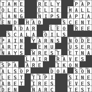 ACROSS 1. Docile 5. Trust 9. Infant food 12. Cassini of fashion 13. Writer Wiesel 14. Shopping center 15. Austrian-born American filmmaker Fritz 16. Pinches, bites 17. Capital of Western Samoa 18. Conclusion 19. Possessed 21. Aroma 22. The sixth month of the Jewish calendar 24. Lion 26. To riddle 27. Any of the three canals of the cochlea 28. Petroleums 29. Ache 30. Tall tales 32. Thickened enlargement 36. Johnson of "Laugh-In" 37. Australian flightless bird 38. One who uses or employs something 39. Negative votes 40. Obtain by seizing forcibly or violently 42. Inactive volcano in Sicily 43. Den 44. All-night dance parties 46. Health resort 49. "We ___ not amused" (Victoria) 50. Picture 51. Columnist Joseph or Stewart 53. ___ good deed 54. Male child 57. For fear that 58. Native american tent (variation) 61. Trig term 62. Collude with 63. Angers 64. Nights before holidays 65. Lair 66. Drug cop 67. Trial DOWN 1. Lacquered or enameled metalware 2. Actor Alda or Thicke 3. Ananias' fault 4. Ovum 5. Tear apart 6. Biblical high priest 7. Mouth edge 8. It is so 9. Some stationery 10. Place in a line 11. Food holder 14. Apple computer (short form) 19. Actor Linden 20. Like ___ of sunshine 21. Mayday 23. Natives or inhabitants of Denmark 24. "_ and Lucy" (Charlie Brown theme song) 25. Raised railways 27. "Two Mules for Sister ____" 28. Channel Islands abalone 29. Baking dish 31. Nest on high 32. New (sp.) 33. Clearly or manifestly demonstrative 34. Cub Scout units 35. Period 40. Armed conflict 41. Musical group of three 43. Pet locale 45. Alias (abbr.) 46. First course 47. Cadet 48. NE Netherlands city 52. Baseball player Mel 53. Plate 55. Singles 56. A home for chicks 58. Shallow baking pan 59. Lyricist Gershwin 60. For each 61. Arrange properly for use