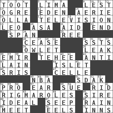 ACROSS 1. A blast of a horn 5. Pale green bean 9. For fear that 13. Legendary monster 14. Locale of original sin 15. Nest on high 16. Rounded earthenware pot or jar 17. Boob tube 19. Lion 20. White ___ sheet 21. Help 22. Conclusion 23. Connect, as a bridge 25. To sift 26. Stop 30. Fast planes 34. A small or young owl 35. Path through which fluid escapes 36. Independent ruler or chieftain 39. Giggle 42. Opposed to 43. (Had) reclined 44. Small island 46. Indian titles of respect 47. Cell (Danish) 48. Basketball assoc. 51. Neighbor of Neb. 54. Adept person 57. Ewer handle 58. Take to court 60. To free from 62. Complicated, petty procedures 65. Father 66. Perfect 67. Ooze 68. Precipitation 69. Confront 70. Snakelike fish 71. Restaurants DOWN 1. Instrument 2. Stares 3. Fourth or lowest deck 4. Afternoon social gathering 5. Allows 6. The main thing one is thinking about 7. Cartoonist voice _ Blanc 8. Approach 9. French article 10. 4th largest of the Great Lakes 11. The Jewish people; Israel 12. Be inclined (to) 15. Assistant 18. Compete 20. Afresh 24. Oak nuts 27. Keyboard modifier key 28. Perceive with the eye 29. Moral principle 30. Scheduled 31. Elected rep. 32. Make lace 33. What Jean-Claude Killy likes to do 36. Raised railways 37. Make imperfect 38. One more than two 40. Compass dir. 41. Pipe bend 45. Otherwise 48. Be tempered by heat 49. Tavern 50. Came up 52. Believer in; advocate of (suffix) 53. Japanese brewing company 54. Demure 55. Travel on or in a vehicle 56. Double curve, resembling the letter S 58. Sew up the eyelids of hawks and falcons 59. United States Postal Service (abbr.) 61. Lairs 63. Floor covering 64. Area sheltered from the wind 65. Indian title of respect (Mr.)