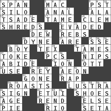 ACROSS 1. Connect, as a bridge 5. Big _ 8. Pacific Standard Time (abbr.) 11. Grain storage tower 12. Of or related to the anus 14. Insect wing 15. Sadhe (variant) 17. Not wild 18. Clement's nick name 19. Fragments 21. Eluded 23. Morning condensation 25. Confederate soldiers (slang) 26. Centimeter-gram-second unit of force 27. "We ___ not amused" (Victoria) 28. Compass dir. 31. Male child 33. John Ritter's dad 35. Softens 37. Puff or smoke 38. Personal Computers (abbr.) 40. Cuts off 41. Tolerate 43. Electrically charged atom 45. Baseball player Mel 46. Purpose 47. Marina Del _, California 50. Period of immesurable duration 52. Went 53. Hit sharply and swiftly 54. Ridicules or criticizes harshly 56. A period of five years 61. Omen 62. Needle holder 65. Imelda's hoard 66. Grow older 67. Tear apart 68. Otherwise 69. Sliced dessert 70. _ de Janeiro 71. Bristle DOWN 1. Fast planes 2. Expression of disdain 3. Having or resembling wings 4. Connecting point 5. Floor covering 6. Santa ___, CA 7. Device for capturing images 8. Diluted with white 9. Downhill vehicle 10. Scottish cap 13. Prying instrument 16. Whirlpool 18. Music discs 20. Transmitted 22. Collude with 24. Shed a tear 26. Colored 28. Stricken, poetically 29. Back-to-school mo. 30. Curvy letter 31. Moves up and down 32. Migrant worker of the '30s 34. One more than ninety 36. At once, immediately (arch.) 37. The 19th letter of the Greek alphabet 39. Fly high 42. Greek god of love 44. Anneal 48. Keyboard key 49. Last 51. Musical composition 52. Separate the seeds from cotton 54. Swiss mountan, "Queen of the Mountains" 55. Double curve, resembling the letter S 57. "______ My Girl" (Turtles hit) 58. Lacquered or enameled metalware 59. Relief 60. Toward the sea 61. Plant excrement 63. Single; one (prefix) 64. Wedding promise