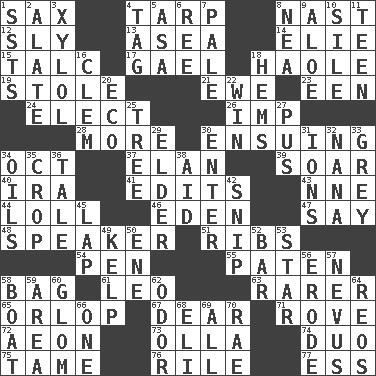 ACROSS 1. Saxophone 4. Canvas cover 8. Political cartoonist Thomas 12. Insidious 13. Toward the sea 14. Writer Wiesel 15. Baby powder 17. Highlander 18. White Person, in Hawaii 19. Fur scarf 21. She-sheep 23. Car or cant ending 24. Choose 26. Naughty child 28. Greater amount 30. Following as a consequence or result 34. Sep. follower 37. Style 39. Fly high 40. Retirement account (abbr.) 41. Prepares for publication 43. Compass dir. 44. Hang loosely or laxly 46. Paradise 47. Declare 48. Orator 51. Teases 54. Writing instrument 55. Eucharist need 58. Paper or plastic container 61. Lion 63. Less widely known 65. Fourth or lowest deck 67. Letter starter 71. Be footloose 72. A really long time 73. Rounded earthenware pot or jar 74. Superhero pair 75. Docile 76. Cause heat under the collar 77. Curvy letter DOWN 1. Fast planes 2. Having winglike extensions 3. Xylene (variant) 4. Label 5. White ___ sheet 6. To riddle 7. Diluted with white 8. Teachers' org. 9. Medicinal plant 10. Filth; sediment 11. Adolescent 16. Clement's nick name 18. Cloth borders 20. Environmental prefix 22. Acquire through effort 25. Woody plant 27. Fluid product of inflammation 29. A person who is older than you are 30. Keyboard key 31. Charged particles 32. Nanny 33. Jennifer or Joel 34. Lubricates 35. Riding implement 36. Lie 38. Help 42. Sever or remove by pinching or nipping 45. Pet locale 49. Seaweed 50. Compass dir. 52. Soap unit 53. Play the lead 56. Wear away 57. Congenital growth or mark on the skin 58. Water vessel 59. Length times width 60. Seize upon or latch onto something 62. Scent 64. Vintage cars 66. Single 68. Connecticut Ivy Leaguer 69. 100% 70. Actress Charlotte