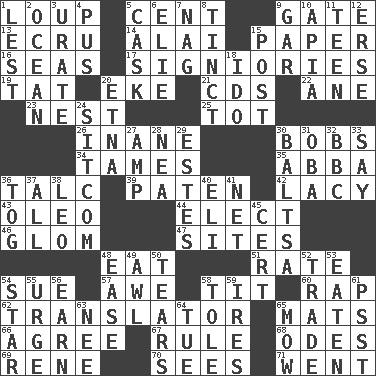 ACROSS 1. Central Nebraska county 5. Penny 9. Yard entry 13. Shade of tan 14. Jai _ 15. Some stationery 16. Oceans 17. Seigniories (variant) 19. Make lace 20. Make supply last 21. Music discs 22. A saturated hydrocarbon 23. A home for chicks 25. Small child 26. Lacking in sense or substance 30. Moves up and down 34. Makes less strong or intense 35. Swedish rock group 36. Baby powder 39. Eucharist need 42. Made of lace 43. Margarine 44. Opt 46. Take by theft 47. Settings 48. Erode 51. Pace 54. Take to court 57. Deep reverence 58. Teat (slang) 60. Strike 62. Interpreter 65. Floor coverings 66. Match 67. General guideline 68. Lyric poems 69. French philosopher Descartes 70. Observes 71. Gone DOWN 1. For fear that 2. Sea 3. A salt of uric acid 4. Fluid product of inflammation 5. Keg 6. Writer Wiesel 7. Tired old horse 8. A color or tint 9. Slender fish 10. Capital of Western Samoa 11. Adolescent 12. Celtic language 15. Mail 18. Wedding promise 20. Inactive volcano in Sicily 24. "Cheers" or "Ellen" 27. Electrical Unit 28. Teachers' org. 29. _____ Park, CO 30. Greek mezzo-soprano Agnes 31. Chief or king in Benin or Nigeria 32. English channel? 33. Declare 36. Coat; cloak 37. Everything 38. Lion 40. Biblical high priest 41. Remaining after all deductions 45. Foregone conclusion 48. Comfort 49. Leather borer 50. Pulls into pieces 52. Buy and sell 53. Consumed 54. Play the lead 55. Goad 56. Merit 58. Lacquered or enameled metalware 59. Angers 61. Inconspicuous attention getter 63. Born 64. Third day of the wk. 65. Cut the grass