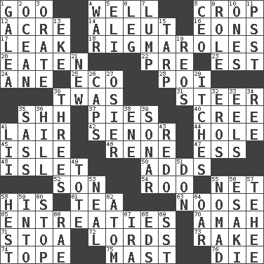 ACROSS 1. Thick or sticky substance 4. Not ill 8. Riding implement 12. Land measure 14. Native American of Southwest Alaska 16. Immeasurably long periods of time 17. Path through which fluid escapes 18. Complicated, petty procedures 20. Eroded 22. Before (prefix) 23. Eastern Standard Time (abbr.) 24. A saturated hydrocarbon 25. Environmental prefix 28. Luau course 30. It was, poetically 31. Bull 35. Quiet! 37. Sliced desserts 40. Algonquian 41. Den 42. Sir (Sp.) 44. Hollow 45. Small island 46. French philosopher Descartes 47. Double-curved letter 48. Small island 50. Does sums 52. Manchild 54. Friend of Pooh 55. Fish or hair follower 58. Part of HMS, perhaps 61. Afternoon social gathering 63. Trap for birds or small mammals 65. Pleas 70. Wet nurse 71. Portico 72. Nobles 73. Immoral or dissolute person 74. Drink excessively 75. Vertical spar for supporting sails 76. Expire DOWN 1. An organ shaped like a helmet 2. Sea 3. Declaim 4. Armed conflict 5. Biblical high priest 6. Part of a journey 7. Mass 8. Corporate head (abbr.) 9. Hero or heavy, e.g. 10. Washington bills 11. Inconspicuous attention getter 13. Supplement with great effort 15. Canvas cover 19. Vintage cars 21. ___ Haven, CT 26. Balmoral and tarboosh 27. Flexible twig of a willow tree 29. Strong, restless desires 30. Trios 32. Greek god of love 33. Snakelike fish 34. Portuguese money of account (variant) 35. Backtalk 36. Land elevation 38. Compass dir. 39. Underwater navigation system 41. Cards in a Roman deck? 43. Redecorate 49. Lug 51. Spanish title 53. Actress Patricia 55. Wanderer 56. 1973 Nobel Price Winner (Physics) Leo 57. Giggle 58. Command 59. To the inside or interior of 60. Cease 62. Smallest unit of an element 64. Boat paddle 66. Actress Charlotte 67. Retirement account (abbr.) 68. Begley and Asner 69. Fast jet (abbr.)