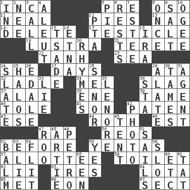 ACROSS 1. South American Indian 5. Before (prefix) 8. Bear (Spanish) 11. Actress Patricia 12. Sliced desserts 13. Tired old horse 14. Erase 17. One of the two male reproductive glands 19. A period of five years 21. Cylindrical with tapered ends 22. Hyperbolic tangent 23. Ocean 24. A female animal or person 27. 24-hour periods 29. _ moment's notice (2 wds.) 32. Dipping utensil 34. Cartoonist voice _ Blanc 36. Volcanic refuse 37. Jai _ 38. Compass dir. 39. Docile 40. Lacquered or enameled metalware 41. Male child 42. Eucharist need 43. Compass dir. 44. Writer of Portnoy's Complaint (1969) 46. Eastern Standard Time (abbr.) 47. Strike 50. Vintage cars 52. Prior to 55. Gossips 57. One to whom something is allotted 59. Bathroom 62. Cards in a Roman deck? 63. Angers 64. Globular water bottle used in Asia 65. Was introduced to 66. Period of immesurable duration 67. Religious group DOWN 1. Working for oneself (abbr.) 2. Born 3. Give a ring to 4. Native American of Southwest Alaska 5. Sliced dessert 6. Musical pauses 7. First name in cosmetics 8. Single time 9. Table seasoning 10. Double curve, resembling the letter S 12. Parent Teacher Assoc. 15. Sadhe (variant) 16. Inactive volcano in Sicily 18. Lyricist Gershwin 20. Poems 24. Schedule 25. Saint headwear 26. Peak District village in England 28. Sir (Sp.) 29. Having winglike extensions 30. Corrects by punishment or discipline 31. Rep 33. Falsehood 35. Poe poem 36. R.R. building 42. Picture 45. Portable shelter 47. Friend of Pooh 48. Nick name for Arthur 49. Stone: prefix 51. Moves on water 52. Lip ointment 53. Writer Wiesel 54. Secret move to avoid paying debts 55. Consenting reply 56. A type of plum 58. Car or cant ending 60. And so on (abbr.) 61. Make lace