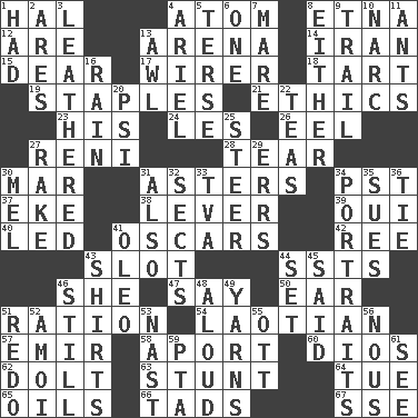 ACROSS 1. Actor Linden 4. Smallest unit of an element 8. Inactive volcano in Sicily 12. "We ___ not amused" (Victoria) 13. Sports stadium 14. SW Asia republic 15. Letter starter 17. One who wires 18. Small pie 19. Paper fasteners 21. Principles of right and wrong 23. Part of HMS, perhaps 24. French article 26. Snakelike fish 27. Painter Guido (1575-1642) 28. Rend 30. Spoil 31. Michaelmas daisies 34. Pacific Standard Time (abbr.) 37. Make supply last 38. Crowbar 39. Fr. "Yes" 40. Directed 41. Motion picture awards 42. To riddle 43. Position in a hierarchy or organization 44. Fast planes 46. A female animal or person 47. Declare 50. Hearing organ 51. Food allowance for one day 54. Of or relating to Laos or its people 57. Independent ruler or chieftain 58. To the left, to Queeg 60. "Vaya con ____" 62. Stupid person 63. Difficult or unusual or dangerous feat 64. Third day of the wk. 65. Petroleums 66. Small boys 67. Compass dir. DOWN 1. Possessed 2. Ancient Greek god of war 3. Resembling or made to resemble leather 4. Satellite of Uranus 5. Laconic 6. Single 7. Female horse 8. One or the other of two 9. Lag or linger behind 10. Drug cop 11. Pismires 13. Leather borer 16. Water falling in drops from the sky 20. 23rd letter of the Greek alphabet 22. Afternoon social gatherings 25. Guide 27. Libertine 29. Blunders 30. Cartoonist voice _ Blanc 31. In addition 32. Religious groups 33. Federal power corp. 34. Likenesses of persons 35. Institutes legal proceedings 36. Make a knot 41. Margarine 43. Chest coverings 44. Arrange properly for use 45. Alleged 46. Free from disturbance or agitation 48. Verbally 49. Entertaining tales 51. Redecorate 52. Mine, in Marseilles 53. Political cartoonist Thomas 55. Baseball player Mel 56. Horse sense 59. Parent Teacher Association (abbr.) 61. Observe