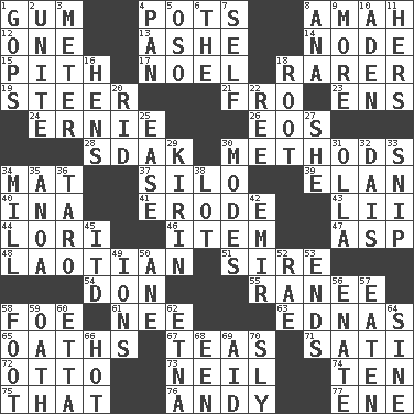 ACROSS 1. Chewing product 4. Plant holders 8. Wet nurse 12. Single 13. American tennis player Robert 14. Connecting point 15. Heart or essence 17. Christmas carol 18. More valued for its uncommonness 19. Guide 21. From 23. Followers of ems 24. Bert's buddy 26. Greek goddess of the dawn 28. Neighbor of Neb. 30. Modes 34. Floor covering 37. Grain storage tower 39. Style 40. _ tizzy (2 wds.) 41. Wear away 43. Cards in a Roman deck? 44. Australian parrot (variant) 46. Detail 47. Viper 48. Of or relating to Laos or its people 51. Beget 54. Spanish title 55. Indian princess (variant) 58. Enemy 61. Born 63. Ferber et al. 65. Expletives 67. Beverages made from leaves 71. Suttee (variant) 72. "Beetle Bailey" pooch 73. Famous astronaut Armstrong 74. "___ Little Indians" 75. Not this but _ 76. "60 Minutes" Commentator Rooney 77. Compass dir. DOWN 1. Republicans 2. Join together 3. Distance measurement 4. Baking dish 5. Bear (Spanish) 6. Definite Article 7. Itself 8. Santa ___, CA 9. Greater amount 10. Arabian gulf 11. Possessive pronoun 16. Coop moms 18. Carrot, for example 20. To free from 22. Portuguese money of account (variant) 25. Relaxation 27. A female animal or person 29. Japanese brewing company 30. Methods 31. Water jar 32. Raised platform 33. Sever or remove by pinching or nipping 34. Place where flour is made 35. Small Philippine buffalo 36. Pacific island yam 38. Car dealer's back yard 42. Independent ruler or chieftain 45. It would 49. Charged atoms 50. A saturated hydrocarbon 52. Actress Charlotte 53. Extremities 56. Related on the mother's side 57. Consumed 58. Lowest support of a structure 59. Pledge 60. Singer James 62. Inactive volcano in Sicily 64. Trig term 66. Being at a high temperature 68. Car or cant ending 69. Help 70. Roguish