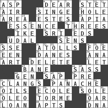 ACROSS 1. Viper 4. Letter starter 8. Proofreading order 12. Atmosphere 13. Burn superficially 14. Hollow 15. Length times width 17. _____ Park, CO 18. Capital of Western Samoa 19. Gist 21. Threesomes 23. D.D.E's nickname 24. _ Lanka 26. Begley and Asner 27. Freehold land 28. Elected reps. 30. Compass dir. 31. Ringlike coral islands and reefs 34. Enemy 37. Car or cant ending 38. Natives or inhabitants of Denmark 39. Santa ___, CA 40. Nonscientific branch of learning 41. Erase 42. Allow 43. Object of repulsion 44. Backtalk 46. Commissioned military rank (abbr.) 47. Plant excrement 50. Before (prefix) 51. Rings loudly 54. Flamboyance 57. Petroleums 58. Learning spot: Fr. 60. Flatfish 62. Butter sub 63. Singer Mel 64. Boat paddle 65. Grant temporary use of 66. Tenement units (abbr.) 67. Heredity factor (abbr.) DOWN 1. American Automobile Association (abbr.) 2. Father 3. Elected leader of a country 4. Flat circles 5. Keyboard key 6. Ripen 7. Take ten 8. Broken pieces 9. Drinks excessively 10. Writer Wiesel 11. Afternoon social gatherings 13. Elected rep. 16. "____ silly question..." 20. Snakelike fish 22. Coop moms 25. Small island 27. One who makes use of a thing 29. Otherwise 30. Ocean 31. Arabian gulf 32. Falsehoods 33. Single 34. It jiggles the polygraph 35. Washington bills 36. Erode 41. Mild oath, euphamism for damn 43. Gillaume's butler role 44. Health resort 45. Curves 46. An organ shaped like a helmet 48. To the left, to Queeg 49. Insides of hands 51. Calm and collected 52. _ and Stitch 53. Stalk of a moss capsule 55. Born 56. Style 59. Police officer (slang) 61. Epoch