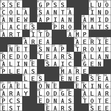 ACROSS 1. Compass dir. 4. Global Positioning Systems (abbr.) 8. Nilotic language 11. Root beer relative 13. Before Barbara or Clara 15. Indiana (abbr.) 16. Afresh 17. Bee-related 18. Among 19. Shoestrings 21. Adept person 22. Floor protectors 23. Tate display 24. It would 27. Electrical Unit 29. Length times width 30. Nest on high 34. Fish or hair follower 36. Fastener 39. Collection of objects 40. Redecorate 41. Pulls apart 43. Actor Alda or Thicke 44. Place in a line 46. Ketch in the Levant 47. Commissioned military rank (abbr.) 48. Entreaties 49. Female horse 51. French article 53. Compass dir. 54. Ocean 57. Highlander 60. Single 63. Supplementing with great effort 65. Like ___ of sunshine 66. Inn 69. Having or resembling wings 70. Personal Computers (abbr.) 71. Ferber et al. 72. Carryall 73. Eastern Standard Time (abbr.) 74. Hearing organs 75. Perceive with the eye DOWN 1. Any of the three canals of the cochlea 2. Underwater navigation system 3. Opt 4. Girls' org. (abbr.) 5. Infant food 6. Clip 7. Play the lead 8. Pale green bean 9. A single undivided whole 10. Likelihood 12. Deep reverence 14. Small Philippine buffalo 18. Electrical Measurement 20. Title for a knight 25. Trial 26. Natives or inhabitants of Denmark 28. Floor protector 29. Lacking a tonal center or key 31. Hero or heavy, e.g. 32. "Terrible" tsar 33. Car or cant ending 34. 1994 drama film starring Jodie Foster 35. Singer Brickell 37. Auto club (abbr.) 38. First class 40. Hit sharply and swiftly 42. Skim 45. Compass dir. 50. To riddle 52. Not divided or shared with others 54. Grain storage towers 55. Maternal 56. Match 57. Stare wonderingly 58. Arches 59. 90 degrees 61. Connecting point 62. Pulitzer Prize-winning author Ferber 64. Krazy ___ of comics 67. Slender fish 68. Double-curved letter