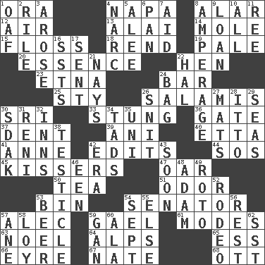 ACROSS 1. Mouth or opening 4. California wine valley 8. Having or resembling wings 12. Wind 13. Jai _ 14. Undercover agent 15. Soft thread for cleaning between teeth 18. Tear apart 19. Diluted with white 20. Core 22. Layer 23. Inactive volcano in Sicily 24. Long, evenly shaped piece 25. Filthy place 26. Deli grouping 30. _ Lanka 33. Feeling sharp psychological pain 36. Yard entry 37. Undesirable depression on a surface 39. Cuckoo 40. Singer James 41. Queen of England 1702-14 42. Prepares for publication 44. Mayday 45. Smoochers 47. Boat paddle 50. Afternoon social gathering 51. Aroma 53. Storage container 54. Legislator 57. Actor Baldwin 59. Highlander 61. Methods 63. Christmas carol 64. High mountains 65. Double-curved letter 66. Jane of fiction 67. Nathan's nickname 68. Baseball player Mel DOWN 1. Clumsy lout 2. Cause heat under the collar 3. Came up 4. Drug cop 5. Toward shelter 6. Baking dish 7. Help 8. Electrical Measurement 9. Grant temporary use of 10. Everything 11. To separate or throw off 16. Fast planes 17. Posted 21. Negative votes 22. Actor Linden 24. Paper or plastic container 26. In a ____ (agitated or irritated) 27. Floor protectors 28. "Tell ____ the Marines!" 29. Oceans 30. Neighbor of Neb. 31. Painter Guido (1575-1642) 32. Restaurants 34. Bits 35. Corn or form start 38. One of the two male reproductive glands 42. Epoch 43. Within a short period 46. Car or cant ending 48. First man 49. Printing process, for short 52. Cowboy competition 53. Fermented drink made from hops 54. Back-to-school mo. 55. Otherwise 56. Relief 57. A saturated hydrocarbon 58. Myrna of the movies 59. Separate the seeds from cotton 60. Wing 62. Fast jet (abbr.)