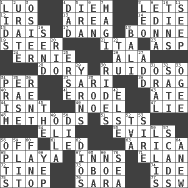 ACROSS 1. Nilotic language 4. South Vietnam president (1954) 8. Allows 12. Big collection agency 13. Length times width 14. Singer Brickell 15. Raised platform 17. Mild oath, euphamism for damn 18. Maid-servant 19. Navigate 21. Call ___ day 23. Viper 24. Bert's buddy 26. According to 28. Dinghy 30. Noisy, rowdy, vocal (Spanish) 34. For each 37. Indian skirt 39. To draw with force 40. Actress Charlotte 41. Eat (away) 43. Had dinner 44. Is not 46. Christmas carol 47. Falsehood 48. Modes 51. Fast planes 54. Connecticut Ivy Leaguer 55. Vices 58. No longer planned or scheduled 61. Directed 63. N. Chile seaport 65. Beach, in Buenos Aires 67. Taverns 71. Liveliness 72. Prong on a fork 73. Mitch Miller's instrument 74. Binary compound 75. Obstruct or block passage 76. "Two Mules for Sister ____" 77. Compass dir. DOWN 1. Flaplike coverings 2. A salt of uric acid 3. Flexible twig of a willow tree 4. Male parent 5. Lyricist Gershwin 6. Car or cant ending 7. Wise men 8. Lion 9. Pulitzer Prize-winning author Ferber 10. Airtight sealed metal containers 11. Ooze 16. Transmit 18. Indonesian resort city 20. _ de Janeiro 22. The 19th letter of the Greek alphabet 25. Celtic language 27. Say or write further 29. Entertaining tales 30. Amusement-park features 31. Relating to the mouth 32. Suttee (variant) 33. Double curve, resembling the letter S 34. Demure 35. Relaxation 36. Monthly bill 38. Friend of Pooh 42. Otherwise 45. Definite Article 49. Rounded earthenware pot or jar 50. Expire 52. Federal power corp. 53. Male parent of an animal 56. Ms. Damita and namesakes 57. Loads 58. Elects 59. Sudden quick movement 60. Papal veil 62. "Vaya con ____" 64. Afresh 66. Slangy assent 68. Basketball assoc. 69. And not 70. Ocean