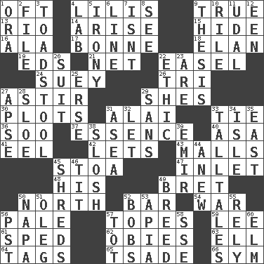 ACROSS 1. Often (poetically) 4. Ms. Damita and namesakes 9. Loyal 13. _ de Janeiro 14. Get up 15. Flintstone garb 16. According to 17. Child's nurse 18. Enthusiasm 19. Begley and Asner 21. Remaining after all deductions 22. Artist's stand 24. Chop _ 26. Three (prefix) 27. Being in motion 29. "______ My Girl" (Turtles hit) 30. Ground plans 31. Jai ____ 33. Neckwear 36. "Barney Miller" actor Jack 37. Substance 40. White ___ sheet 41. Snakelike fish 42. Allows 43. Promenades 45. Portico 47. An arm off of a larger body of water 48. Part of HMS, perhaps 49. Cy Young winner Saberhagen 50. Compass direction 52. Long, evenly shaped piece 54. Armed conflict 56. Light colored 57. Drinks excessively 59. Area sheltered from the wind 61. Broke a traffic law 62. Off-Broadway awards 63. Pipe bend 64. Labels 65. Sadhe (variant) 66. Symbol (abbr.) DOWN 1. Mouth or opening 2. Do some clerical work 3. Inedible or poisonous agaric 4. Experiment locale 5. Literary sarcasm 6. Actor's bit 7. Is not 8. Perceive with the eye 9. College paper 10. Cause heat under the collar 11. Freehold land 12. Car or cant ending 20. Set or collection 22. Principle of right and wrong 23. "We ___ not amused" (Victoria) 25. Celtic language 27. Domed church section 28. A type of plum 29. Without 31. Toward the sea 32. Allow 33. Baron Munchausen's specialties 34. Capri or Wight 35. Compass direction 38. Splash clumsily 39. Independent ruler or chieftain 44. Afresh 45. Fragments 46. Teat (slang) 49. A special lineage 50. California wine valley 51. Cassini of fashion 52. Moves up and down 53. Capital of Western Samoa 55. Have trust in 56. Pacific Standard Time (abbr.) 57. Small child 58. Compass dir. 60. Shade tree