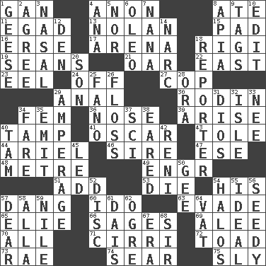 ACROSS 1. Separate the seeds from cotton 4. At once, immediately (arch.) 8. Had dinner 11. Mild oath 13. Pitcher Ryan 15. Groovy apt. 16. Celtic language 17. Sports stadium 18. Swiss mountan, "Queen of the Mountains" 19. Seines 21. Rowing implement 22. Compass direction 23. Snakelike fish 24. Below a satisfactory level 27. Police officer (slang) 29. Of or related to the anus 30. "The Thinker" sculptor 34. Opposite of masc. 36. Olfactory organ 39. Get up 40. Pack (down) 41. Witty Wilde 43. Lacquered or enameled metalware 44. Satellite of Uranus 46. Beget 47. Compass dir. 48. Distance measurement (Brit.) 49. Engineer (abbr.) 51. Say or write further 53. Pass on 54. Part of HMS, perhaps 57. Mild oath, euphamism for damn 60. Wedding promise 63. Dodge 65. Writer Wiesel 66. Gurus 69. Toward shelter 70. 100% 71. High-altitude cloud 72. Frog relative 73. Actress Charlotte 74. Scorch 75. Cunning DOWN 1. Honkers 2. Match 3. Relating to the nose 4. Santa ___, CA 5. Not either 6. Margarine 7. Nanny 8. Capital of Western Samoa 9. Labels 10. Prepare for publication 12. Lair 14. Drug cop 18. News announcer 20. Male offspring 25. Papal veil 26. Soft thread for cleaning between teeth 28. Mouth or opening 29. Electrical Measurement 31. "Vaya con ____" 32. Capri or Wight 33. Born 34. Conductor's collection 35. Send forth 37. _-fi 38. Having ears or earlike features 40. Scottish cap 42. Painter Guido (1575-1642) 45. Directed 50. Unit of force equal to gravity 52. Plate 54. Rings 55. Standard of perfection 56. Shabby and untidy 57. Letter starter 58. Silent film actress Nazimova 59. Mediterranean tributary 61. Raised platform 62. Legendary monster 64. Large container 67. Epoch 68. Title for a knight