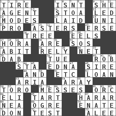 ACROSS 1. Hoop that covers a wheel 5. Is not 9. A female animal or person 12. Representative 14. Portico 15. Directed 16. Methods 17. Put down 18. University (slang) 19. Adept person 20. Michaelmas daisies 23. Celtic language 24. Woody plant 25. Snakelike fish 27. Israeli folk dance 30. "We ___ not amused" (Victoria) 32. Mayday 33. "This won't hurt ____!" 34. Have trust in 36. Fish or hair follower 38. Apply (a substance) by light strokes 39. Third day of the wk. 40. Director Reiner 43. R.R. building 46. Pulitzer Prize-winning author Ferber 48. Title for a man of rank and authority 49. Added to 51. And so on (abbr.) 52. Grant temporary use of 53. Roberta Peters solo 54. Like ___ of sunshine 56. "Corrida" creature 58. Makes clutter 61. The grampus (Milton) 64. Biblical high priest 65. Small pie 66. Ethiopian city, capital of Harari 68. Teachers' org. 69. Legendary monster 70. Related on the mother's side 71. Spanish title 72. Trial 73. Toward shelter DOWN 1. Pack (down) 2. Composer Stravinsky 3. Do over again 4. Compass dir. 5. Small island 6. Play the lead 7. Annoying sounds 8. Bit 9. Disparaging remarks 10. Coop moms 11. Singer Brickell 13. Russian ruler of old 21. Dry up 22. Cylindrical with tapered ends 23. Otherwise 24. Make lace 26. A really long time 27. Possessed 28. Chief or king in Benin or Nigeria 29. Chest bones 31. Evade 35. Gossips 37. Musical group of three 41. Mouth or opening 42. Benjamin's nick name 44. Edible starchy tuberous root 45. Black tropical American cuckoo 47. Land measure 48. Secret 50. Break 53. Believer in; advocate of (suffix) 55. American tennis player Robert 56. Watch over 57. Margarine 59. Blunders 60. Proofreading order 61. Of the mouth 62. Assign a rank or rating to 63. Algonquian 65. Small child 67. Santa ___, CA
