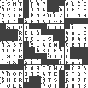 ACROSS 1. Is not 5. Infant food 8. Toward shelter 12. Brightly colored fish 13. _ tizzy (2 wds.) 14. Sibling's daughter 15. Nathan's nickname 16. Census information 19. R.R. building 20. Elected representative 21. Narrow, elongated depression 23. And so on (abbr.) 24. French article 27. Make new 30. Short-tailed, large-bodied rat 31. Ringlike coral islands and reefs 34. SW Asia republic 35. Political cartoonist Thomas 38. Killed 40. Penny 41. Butter sub 42. Most capable 44. Russian ruler of old 45. Von Bismarck 46. Greek goddess of the dawn 47. Put into a specified state 50. Mouths or openings 53. Chrissie's court nemesis 57. Tax preparer (abbr.) 59. Conciliate 63. Close up, plug up 64. Upper-body garment 65. Mountains (abbr.) 66. Carrot, for example 67. Lacquered or enameled metalware 68. Cooking vessel 69. Lodging establishments DOWN 1. Charged atoms 2. Arguments over trivial matters 3. Relating to or accompanying birth 4. Definite Article 5. Corncob 6. Soon (poet.) 7. Dad 8. Small island 9. Flowery wreath 10. Environmental prefix 11. Car or cant ending 14. Drug cop 17. Shoshoni 18. Car dealer's back yard 20. Proofreading order 22. Speaker 24. Old wives' tales, e.g. 25. Flair 26. Transmitted 28. Two (Sp.) 29. Water jar 30. Winning man's name 32. Experiment locale 33. Grain storage tower 35. Brief written record 36. In addition 37. Oceans 39. Remaining after all deductions 43. Portico 47. Stricken, poetically 48. Ingest 49. Three (prefix) 51. 13-14th century defensive garment 52. Soup utensil 54. Pack (down) 55. "Tell ____ the Marines!" 56. Egg locale 58. Tenement units (abbr.) 59. Pacific Standard Time (abbr.) 60. 17th letter of the Greek alphabet 61. Petroleum 62. Before (prefix) 63. _ Lanka