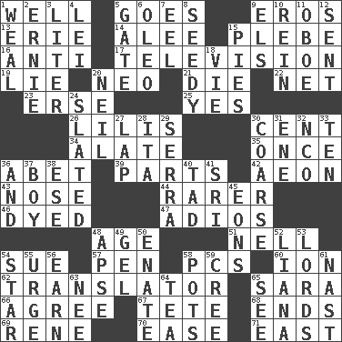 ACROSS 1. Water source 5. Leaves 9. Greek god of love 13. One of the Great Lakes 14. Toward shelter 15. Cadet 16. Opposed to 17. Household entertainment appliance 19. Whopper 20. Modern: prefix 21. Expire 22. Fish or hair follower 23. Celtic language 25. Affirmative reply 26. Ms. Damita and namesakes 30. Penny 34. Having winglike extensions 35. At one time in the past 36. Collude with 39. Pieces 42. Period of immesurable duration 43. Characteristic smell of wine 44. More uncommon 46. Colored 47. Goodbye (Sp.) 48. Ripen 51. 1994 drama film starring Jodie Foster 54. Institute legal proceedings 57. Fenced enclosure 58. Personal Computers (abbr.) 60. Electrically charged atom 62. Interpreter 65. "Two Mules for Sister ____" 66. Match 67. Wig 68. Conclusions 69. French philosopher Descartes 70. Comfort 71. Compass direction DOWN 1. Welt 2. Bert's buddy 3. 61 cubic inches 4. Luau accessory 5. Yard entry 6. Butter sub 7. Snakelike fish 8. Full of seeds 9. Raised railways 10. It's straight from the horse's mouth 11. Mitch Miller's instrument 12. Emitted 15. Sliced desserts 18. Compete 20. Famous astronaut Armstrong 24. Scheduled 27. Pet locale 28. Call ___ day 29. Spanish missionary in California 30. Rough 31. Compass dir. 32. Non-commissioned officer (abbr.) 33. "___ Little Indians" 36. Plus 37. Male child 38. Compass dir. 40. Small amount or degree 41. Indian title of respect (Mr.) 45. Immeasurably long periods of time 48. Domed church section 49. Set 50. Related on the mother's side 52. Woody, climbing, usually tropical plant 53. Titled peers of a realm 54. Play the lead 55. Goad 56. Merit 58. Cooking vessels 59. Algonquian 61. Political cartoonist Thomas 63. Born 64. Beverage made from leaves 65. Observe