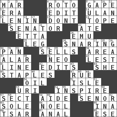 ACROSS 1. Spoil 4. Printing process, for short 8. Open wide 12. Epoch 13. Prepare for publication 14. ____ Bator 15. Soviet premier 1918-24 18. Do not 19. Drink excessively 20. Elected representative 22. Had dinner 23. Singer James 24. Australian flightless bird 25. Part of a journey 26. Catching in a trap 30. Baking dish 33. Makes a sale 36. Type of rug 37. Having or resembling wings 39. Modern: prefix 40. For fear that 41. Actor's bit 42. Prepares for publication 44. A female animal or person 45. Paper fasteners 47. Sorrow 50. Lubricate 51. Small island 53. RI univ. 54. Motivate 57. Religious group 59. Helper 61. Sir (Sp.) 63. Not divided or shared with others 64. Christmas carol 65. _ tizzy (2 wds.) 66. Russian ruler of old 67. Of or related to the anus 68. Compass dir. DOWN 1. Cartoonist voice _ Blanc 2. Ancient Greek god of war 3. Indian princess (variant) 4. Do over again 5. Scent 6. Shallow baking pan 7. Baseball player Mel 8. From the throat 9. _ vera 10. Infant food 11. Compass dir. 16. International (abbr.) 17. Nathan's nickname 21. Labels 22. Housemaid (var.) 24. Followers of ems 26. Groove 27. Angers 28. Tender 29. Yard entry 30. Friends 31. Came down and settled, as after flight 32. Grandmother 34. Extremities 35. Flowery wreath 38. News announcer 42. Snakelike fish 43. Indian titles of respect 46. Cards in a Roman deck? 48. United States Postal Service (abbr.) 49. Writer Wiesel 52. Bert's buddy 53. Southern CA. univ. 54. The content of cognition 55. 1994 drama film starring Jodie Foster 56. Immeasurably long periods of time 57. Fast jet (abbr.) 58. Greek goddess of the dawn 59. Santa ___, CA 60. Electrically charged atom 62. Actress Charlotte