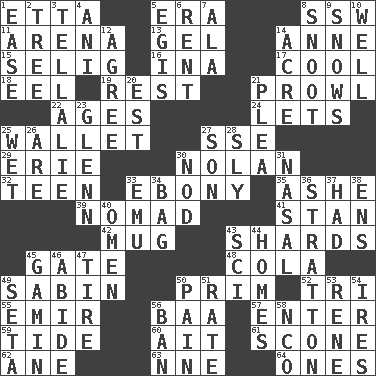 ACROSS 1. Singer James 5. Epoch 8. Compass dir. 11. Sports stadium 13. Set 14. Singer Murray 15. Former Milwaukee Brewers owner Bud 16. _ tizzy (2 wds.) 17. Calm and collected 18. Snakelike fish 19. Respite 21. Move like a hungry wolf 22. Eons 24. Allows 25. Place for singles 27. Compass dir. 29. 4th largest of the Great Lakes 30. Pitcher Ryan 32. Adolescent 33. Dark wood 35. American tennis player Robert 39. Wanderer 41. Comedian Laurel of Laurel & Hardy 42. Large cup 43. Pottery fragments 45. Yard entry 48. Root beer relative 49. Unit of acoustic absorption 50. Demure 52. Three (prefix) 55. Arab leader 56. Sound made by sheep 57. Keyboard key 59. Periodic rise and fall of the sea level 60. Small island 61. Biscuitlike quick bread 62. One (Scot) 63. Compass dir. 64. Washington bills DOWN 1. Comfort 2. Relationship diagram 3. Copy Pinocchio 4. Cuckoo 5. The front part of a cuirass 6. Monthly bill 7. Insect wing 8. Snout, nose 9. Overwhelms 10. Water source 12. Match 14. 1/640 square mile 20. Eastern Standard Time (abbr.) 21. Entreaty 23. American astronaut and politician John 25. Dripping 26. "We ___ not amused" (Victoria) 27. Manchild 28. Stealthy 30. Lower and raise head in agreement 31. Relating to the nose 33. Australian flightless bird 34. Paper or plastic container 36. Ski resort town in Vermont 37. Possessed 38. Followers of ems 40. Sign of something about to happen 43. _-fi 44. Residences 45. Street urchin 46. Tolerate 47. Become fatigued 49. Bristle 50. Ache 51. Assign a rank or rating to 53. French philosopher Descartes 54. Angers 56. Prohibit 58. Non-commissioned officer (abbr.)