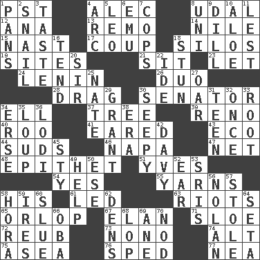 ACROSS 1. Pacific Standard Time (abbr.) 4. Actor Baldwin 8. Allodial 12. Santa ___, CA 13. San ____ (Riviera town) 14. "Death on the ____" 15. Political cartoonist Thomas 17. Clever action or accomplishment 18. Grain storage towers 19. Settings 21. Be seated 23. Allow 24. Soviet premier 1918-24 26. Superhero pair 28. To trail on the ground 30. Elected representative 34. Pipe bend 37. Woody plant 39. Western Nevada city 40. Friend of Pooh 41. Having ears or earlike features 43. Environmental prefix 44. Beer foam 46. California wine valley 47. Remaining after all deductions 48. Curse 51. Jacques Cousteau's middle name 54. Affirmative reply 55. Tall tales 58. Part of HMS, perhaps 61. Directed 63. Disturbances 65. Lowest deck of a ship 67. Enthusiasm 71. _ gin 72. Reuben's nickname 73. Words to Nanette 74. The first octave above the treble staff 75. Toward the sea 76. Moved rapidly 77. Teachers' org. DOWN 1. Baking dishes 2. Slow-paced one 3. Clothes sense 4. Curve 5. Lion 6. Australian flightless bird 7. 911 reaches them 8. Single; one (prefix) 9. Deli pickle 10. _ vera 11. For fear that 16. Look after 18. Surprise greatly 20. Title for a knight 22. Binary compound 25. Nathan's nickname 27. Boat paddle 29. Let have 30. Oozy 31. Adolescent 32. At one time in the past 33. Carrot, for example 34. Celtic language 35. Central Nebraska county 36. Farming town in central California 38. Period 42. _ Jones' Locker 45. Filthy place 49. Assist 50. Compass dir. 52. Ewer handle 53. Indian titles of respect 56. Pitcher Ryan 57. Took without asking 58. Israeli folk dance 59. Angers 60. Change direction abruptly 62. Cub Scout units 64. Stalk of a moss capsule 66. Chief or king in Benin or Nigeria 68. Chop off 69. A saturated hydrocarbon 70. Dreamland