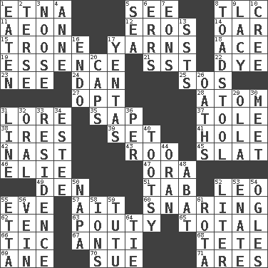 ACROSS 1. Inactive volcano in Sicily 5. Observe 8. Affectionate concern, for short 11. A really long time 12. Greek god of love 14. Rowing implement 15. Heavy duty weighing machine 17. Tall tales 18. Adept person 19. Substance 21. Fast jet (abbr.) 22. Color 23. Born 24. Daniel's nick name 25. Distress signal 27. Elect 28. Tiny particle 31. Old wives' tales, e.g. 35. Plant excrement 37. Lacquered or enameled metalware 38. Angers 39. Put into a specified state 41. Hollow 42. Political cartoonist Thomas 43. Friend of Pooh 45. Narrow board 46. Writer Wiesel 47. Mouth or opening 49. Lair 51. Keyboard key 52. Lion 55. Night before a holiday 57. Small island 60. Catching in a trap 62. "___ Little Indians" 63. Marked by pouting 65. "_____ Recall" 66. Nervous spasm 67. Against 68. False hair 69. A saturated hydrocarbon 70. Take to court 71. Ancient Greek god of war DOWN 1. Ingested 2. Laconic 3. Trap for birds or small mammals 4. Singer Murray 5. Ocean 6. Blunders 7. Immeasurably long periods of time 8. Inedible or poisonous agaric 9. Made of lace 10. Algonquian 13. Fast planes 16. Inside; within (prefix) 17. Gossips 20. Smile enhancers 26. Curses 29. Spanish pot 30. Confront 31. Actor's bit 32. Of the mouth 33. Home 34. First name in cosmetics 36. For each 40. A girl or young woman (variant) 44. Northwest Algerian city 48. Blind as ____ 50. California wine valley 52. 61 cubic inches 53. Maternal 54. Stares 55. Singer James 56. Distinctive style or manner 58. Charged atoms 59. Ballerina skirt 61. Round or rotation of duties 64. Neckwear