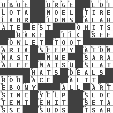 ACROSS 1. Mitch Miller's instrument 5. Goad 9. Car dealer's back yard 12. Globular water bottle used in Asia 13. Christmas carol 14. Become fatigued 15. Cowardly lion portrayer 16. Charged particles 17. Having or resembling wings 18. Had dinner 19. Eastern Standard Time (abbr.) 21. Leaves out 22. Libertine 24. Affectionate concern, for short 26. Perceive with the eye 27. A small or young owl 28. A blast of a horn 29. Operatic vocal solo 30. Not well drained, as in land 32. Smallest unit of an element 36. Political cartoonist Thomas 37. Compass dir. 38. "Two Mules for Sister ____" 39. Toward shelter 40. Taiwanese island in East China Sea 42. Narrow board 43. Floor coverings 44. Allots cards 46. Director Reiner 49. Adept person 50. Set down 51. Black 53. 100% 54. Nonscientific branch of learning 57. Trig term 58. Sharp bark 61. A type of plum 62. Portable shelter 63. Give off 64. Bristle 65. Compass dir. 66. Beer foam 67. Russian ruler of old DOWN 1. Spanish pot 2. Water vessel 3. Else 4. Ewer handle 5. A single undivided whole 6. Friend of Pooh 7. Commissioned military rank (abbr.) 8. Raised railways 9. Ms. Damita and namesakes 10. Declaim 11. Laconic 14. Scottish cap 19. Make supply last 20. Puts into a specified state 21. Sep. follower 23. Having winglike extensions 24. Drinks excessively 25. Myrna of the movies 27. Spoken 28. Portable shelters 29. Santa ___, CA 31. Maternal 32. Slender Brazilian palm 33. Baron Munchausen's specialties 34. Mouths or openings 35. Floor covering 40. Big _ 41. Hereditary estate 43. Fifth month 45. Pipe bend 46. Musical pauses 47. Off-Broadway awards 48. Maid-servant 52. Remaining after all deductions 53. Tenement units (abbr.) 55. Roll call or roster of names 56. Rend 58. It is so 59. Australian flightless bird 60. Hat (slang) 61. Fast jet (abbr.)