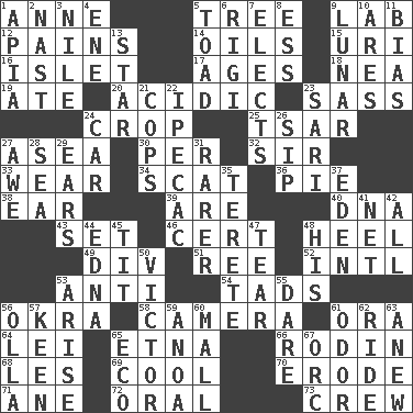 ACROSS 1. Queen of England 1702-14 5. Woody plant 9. Experiment locale 12. Aches 14. Lubricates 15. RI univ. 16. Small island 17. Grows older 18. Teachers' org. 19. Had dinner 20. Being or containing an acid 23. Backtalk 24. Riding implement 25. Russian ruler of old 27. At sea 30. For each 32. Title for a knight 33. Put on (as clothing) 34. Jazz singing style 36. Sliced dessert 38. Hearing organ 39. "We ___ not amused" (Victoria) 40. Heredity factor (abbr.) 43. Arrange properly for use 46. Sure thing 48. Person who is morally reprehensible 49. HTML Container Element 51. Portuguese money of account (variant) 52. International (abbr.) 53. Against 54. Small boys 56. Gumbo ingredient 58. Device for capturing images 61. Mouth or opening 64. Luau accessory 65. Inactive volcano in Sicily 66. "The Thinker" sculptor 68. French article 69. Calm and collected 70. Wear away 71. One (Scot) 72. Spoken 73. Ship's personnel DOWN 1. Capital of Western Samoa 2. Political cartoonist Thomas 3. The longest river in the world 4. Compass dir. 5. Frog relative 6. Swiss mountan, "Queen of the Mountains" 7. Opts 8. Double-curved letter 9. Type of eclipse 10. Ancient Greek god of war 11. Prejudice 13. Play the lead 21. 911 reaches them 22. Medicinal drug used to evoke vomiting 23. Indian skirt 24. 4-wheeled motor vehicle 26. Small drink 27. Deep reverence 28. Ocean 29. Hearing organs 31. Less widely known 35. Cylindrical with tapered ends 37. Genesis locale 41. Fish or hair follower 42. 100% 44. Pulitzer Prize-winning author Ferber 45. Teat (slang) 47. Pull into pieces 48. Part of HMS, perhaps 50. Winning man's name 53. Ascend 55. Have the gumption 56. Spanish pot 57. Peachy ____! 59. Small Philippine buffalo 60. Shopping center 61. Aroma 62. Travel on or in a vehicle 63. Afresh 65. Environmental prefix 67. The grampus (Milton)
