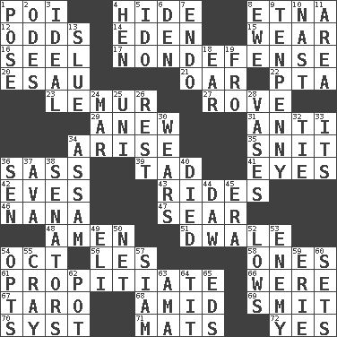ACROSS 1. Luau course 4. Flintstone garb 8. Inactive volcano in Sicily 12. Likelihood 14. Paradise 15. Erode 16. Sew up the eyelids of hawks and falcons 17. Unrelated to defense, as in spending 20. Son of Isaac 21. Boat paddle 22. Parent Teacher Assoc. 23. Arboreal primate 27. Be footloose 29. Afresh 31. Against 34. Ascend 35. In a ____ (agitated or irritated) 36. Backtalk 39. Small amount or degree 41. Sight organs 42. Nights before holidays 43. Amusement-park features 46. Nanny 47. Shrivel 48. So be it 51. A sleeping potion; an opiate (poet.) 54. Sep. follower 56. French article 58. Singles 61. Appease 66. Past tense of be (plural) 67. Edible starchy tuberous root 68. Among 69. Stricken, poetically 70. System (abbr.) 71. Floor protectors 72. Affirmative reply DOWN 1. Airs 2. Lyric poems 3. Perfect 4. Layer 5. Wedding promise 6. Lair 7. Inside; within (prefix) 8. She-sheep 9. 3-inch nail 10. Political cartoonist Thomas 11. Type of rug 13. Change direction abruptly 18. Ewer handle 19. Away 24. Impair 25. University (slang) 26. Respite 28. Flower holders 30. Erodes 32. Make a knot 33. ___ a Wonderful Life 34. Indian state 36. Elected rep. 37. Actress Gardner 38. Elected representatives 40. Passed on 44. Fool 45. Period 49. Biblical high priest 50. Fish or hair follower 52. Coldest temperatures 53. Foe 54. Chooses 55. Supercomputer manufacturer 57. Thailand, formerly 59. 4th largest of the Great Lakes 60. Arranges properly for use 62. Plant holder 63. Nursemaid (var.) 64. Teat (slang) 65. Begley and Asner